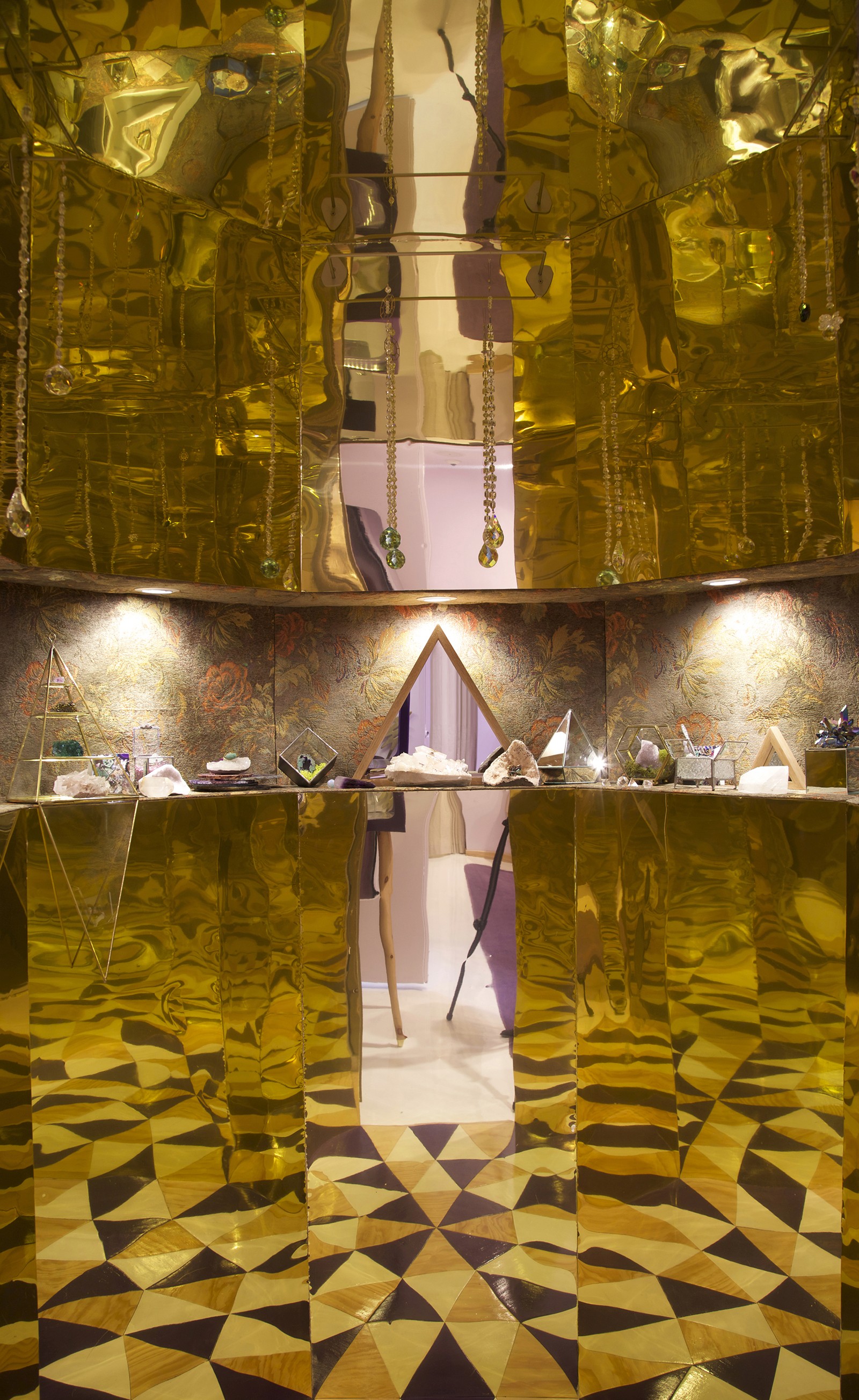 The central display island features a sapphire blue velvet tabletop and a sculptural selection of cacti, with a faceted concave ceiling, made of the same gold-toned material as the cave, lowered to meet it. Amethyst-colored carpeting runs through the space, which is accented by custom millwork and mirrors. An expansive fiber art piece softens the back wall, crafted by a local nonprofit women’s collective.