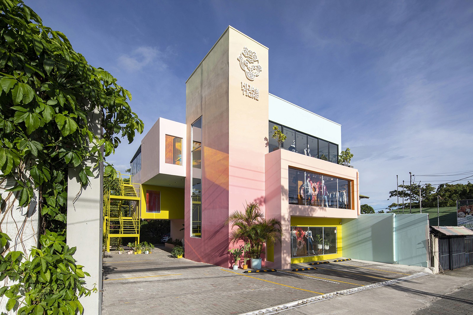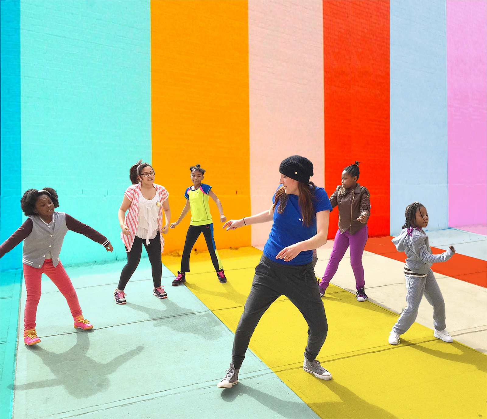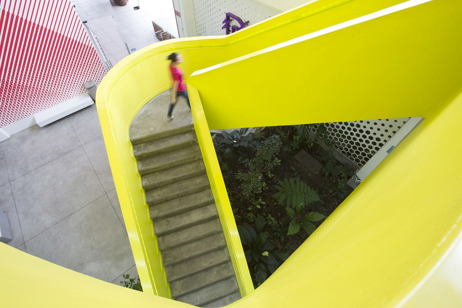 Large open day-lit spaces with brightly colored elements instill a friendly and enthusiastic approach to exercise. To develop the combination of graphic patterns, materials and textures we worked very closely on brand conception with Milk n’ Cookies, a local design and digit agency. The goal was to create a look and feel in the branding material and physical space that were geared toward adults and young people who are more interested in light cardio fitness and in traditional bodybuilding. In order to reach the main workout area, members ascend a sculptural yellow staircase after passing through a narrow mirror corridor with a hexagon overlay, to access the locker area.