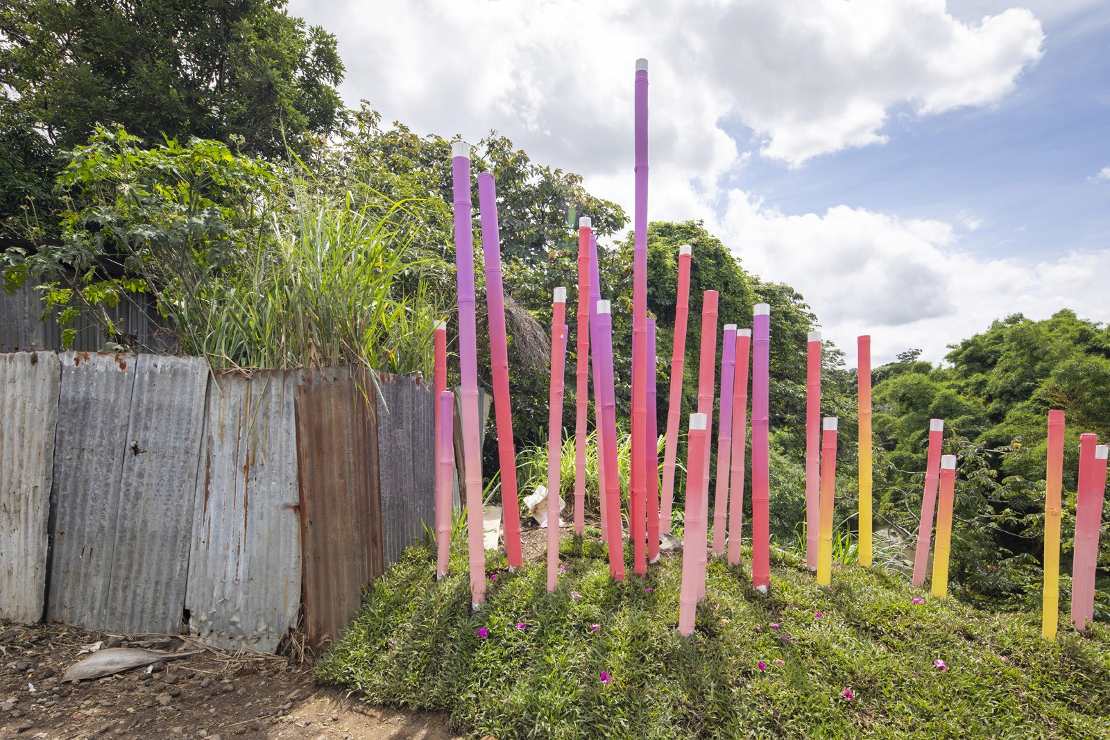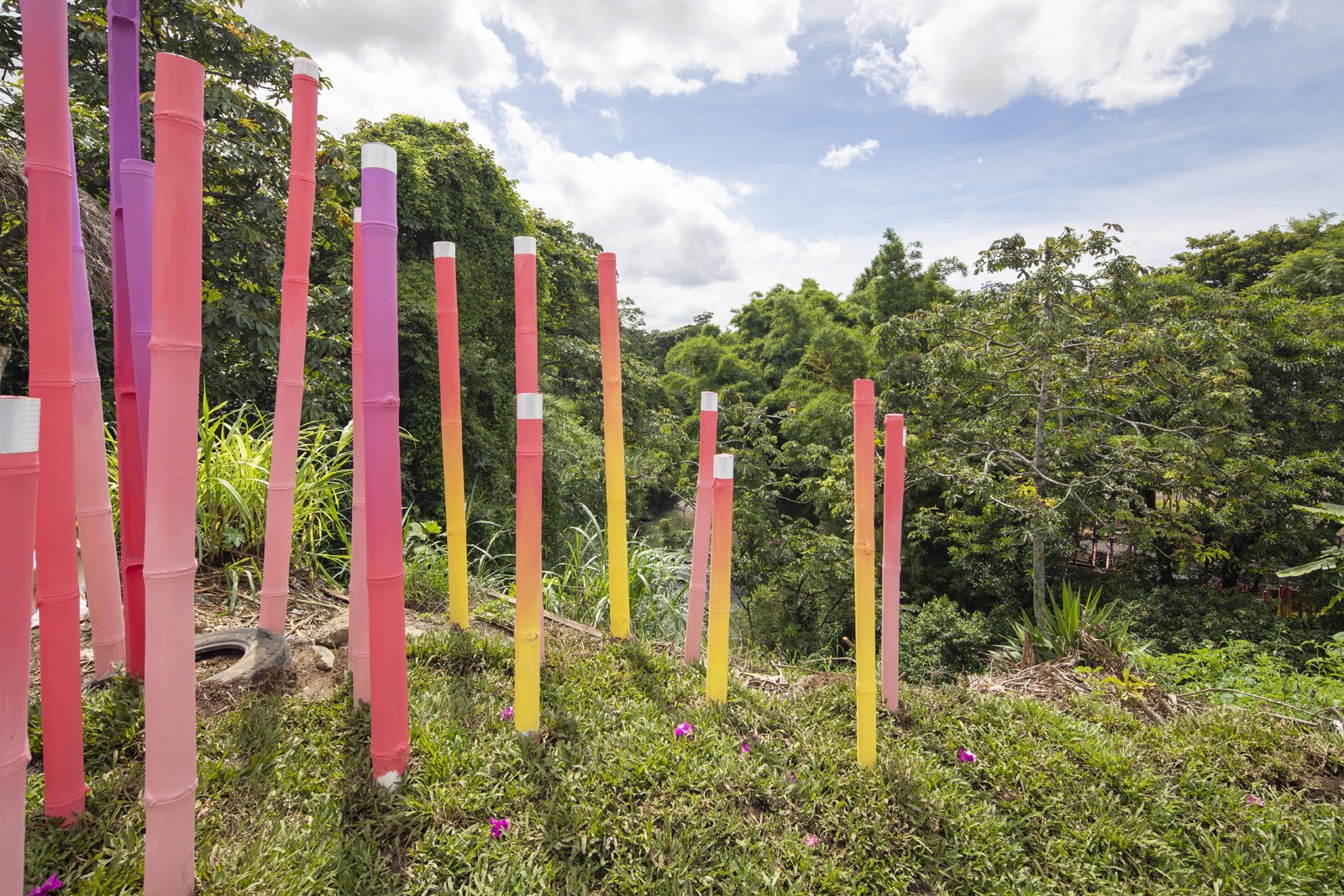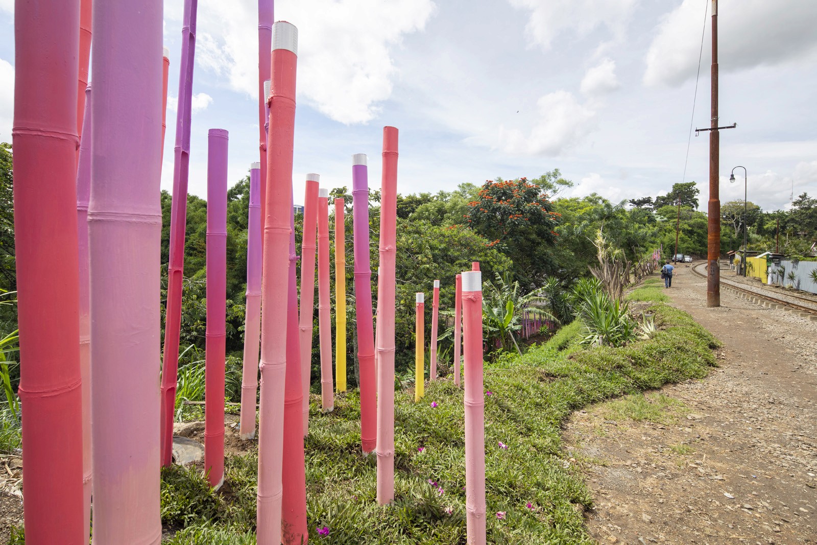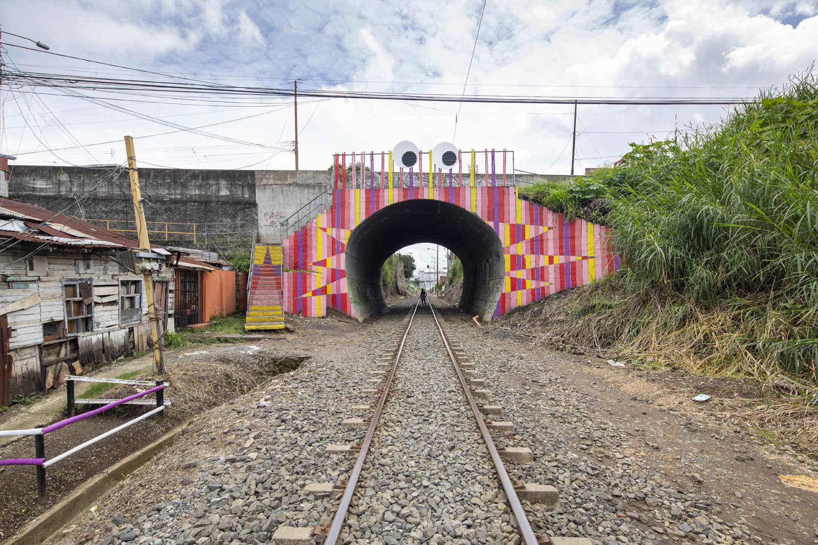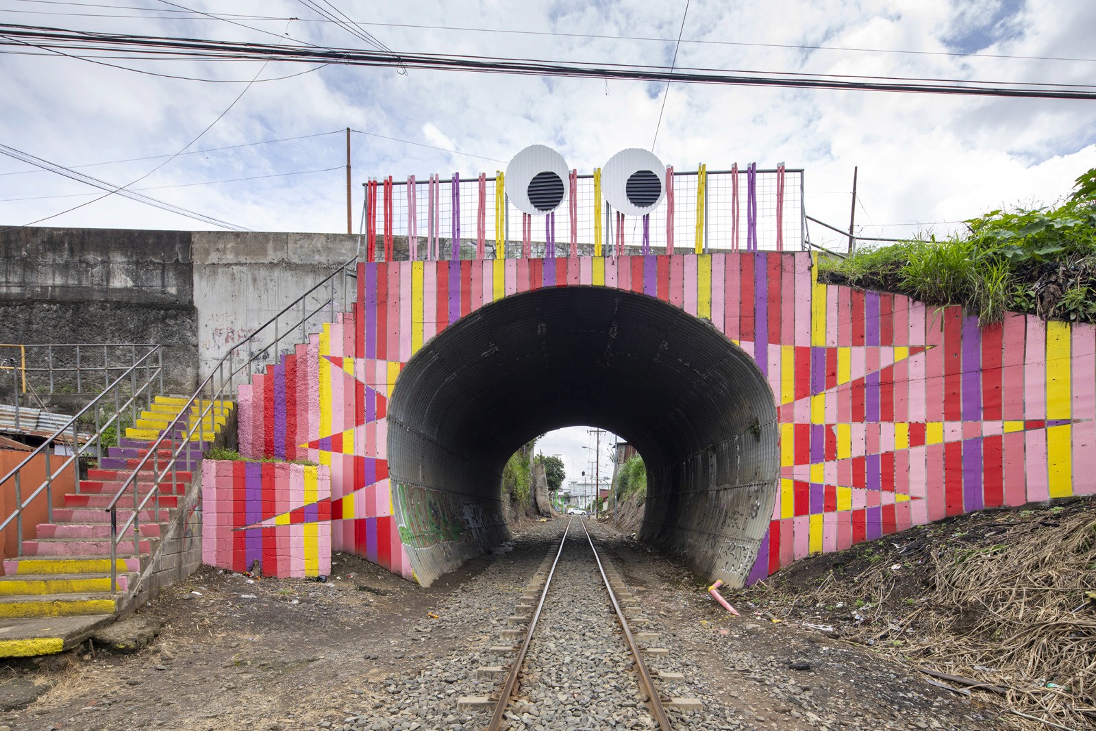 Located near La Feria Verde in Aranjuez, Parque O2 transforms a neglected railway underpass into a vibrant public landscape. A bold graphic intervention wraps the tunnel in color, turning infrastructure into a neighborhood landmark. The project incorporates air-purifying paint that helps capture emissions, reinforcing its environmental intent. Along the hillside, gradient bamboo poles integrate reflective bands, creating a subtle night presence and extending the experience beyond daylight. Through color, reuse, and ecological strategies, Parque O2 reclaims residual space as a playful, sustainable place for community and wonder.