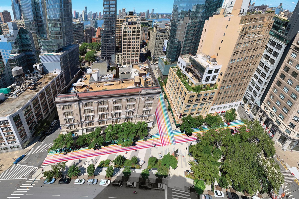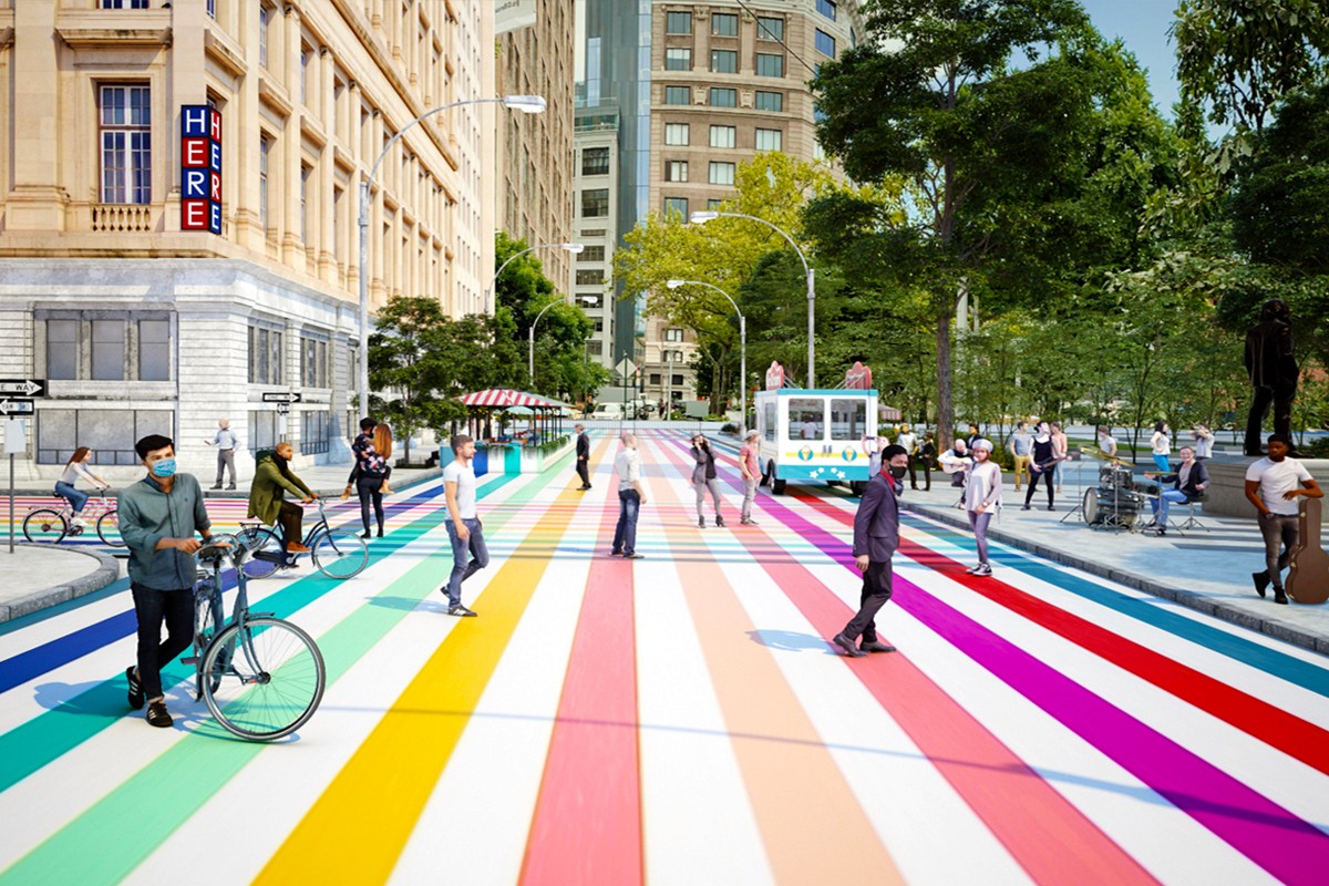The “Care for Hudson Square” initiative seeks to reactivate the public realm in the wake of the Covid-19 pandemic with a site-specific installation that fosters community in the public realm. Our design for the initiative enlivens the site at Little 6th Ave, between Spring and Broom Street, through striking but simple artistic intentions. Bright color traces the public routes along asphalt and sidewalks, supplemented with temporary shade tents, lighting, and seating to support the movement and activities of pedestrians and residents. This method of playful and bold site activation communicates the vibrancy and resilience of this location, reflecting the wealth of cultural and educational institutions in the area. The project aims to facilitate responsible social interactions, both planned and spontaneous, to help build engagement for other sites in the Hudson Square community both in person and virtually.
