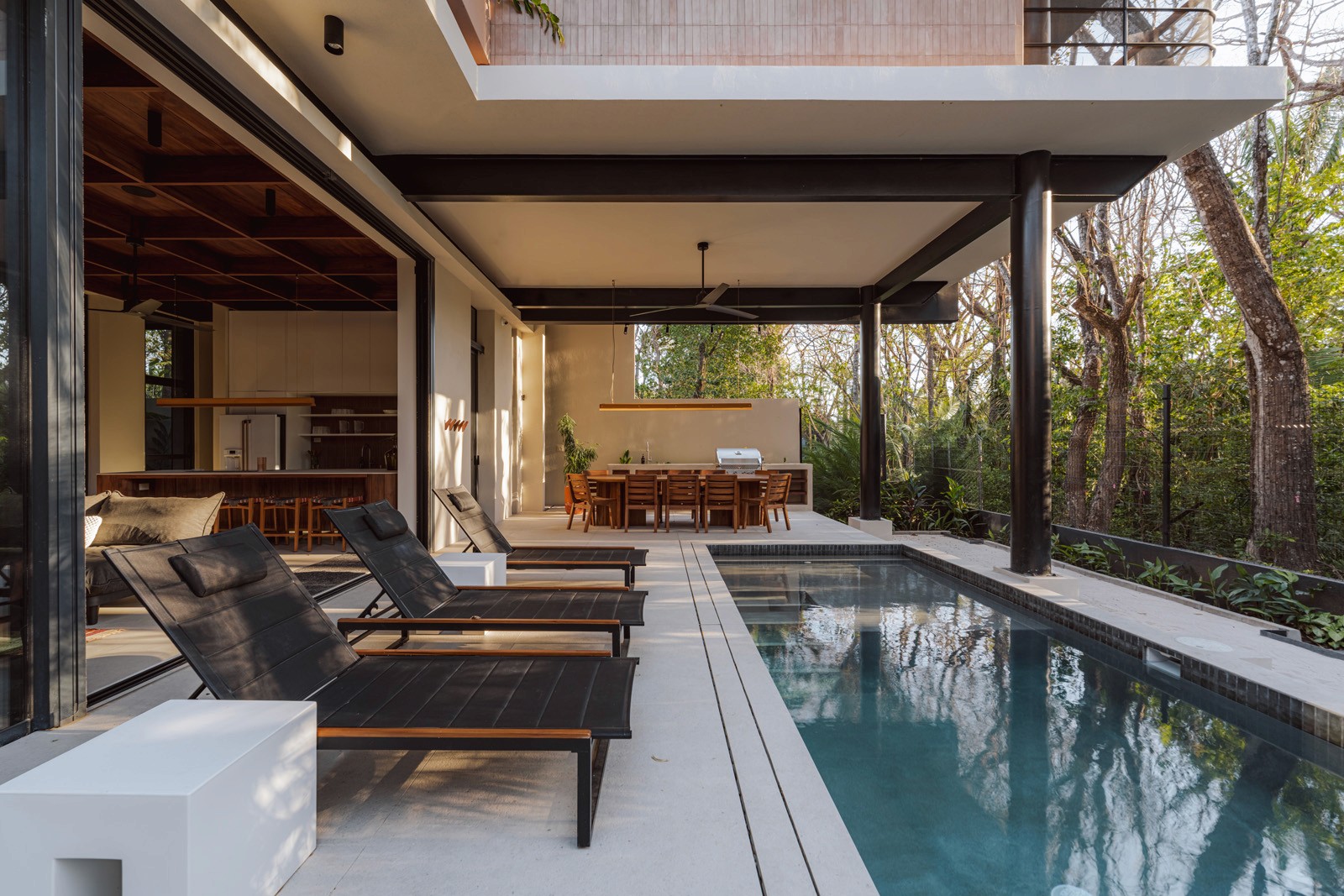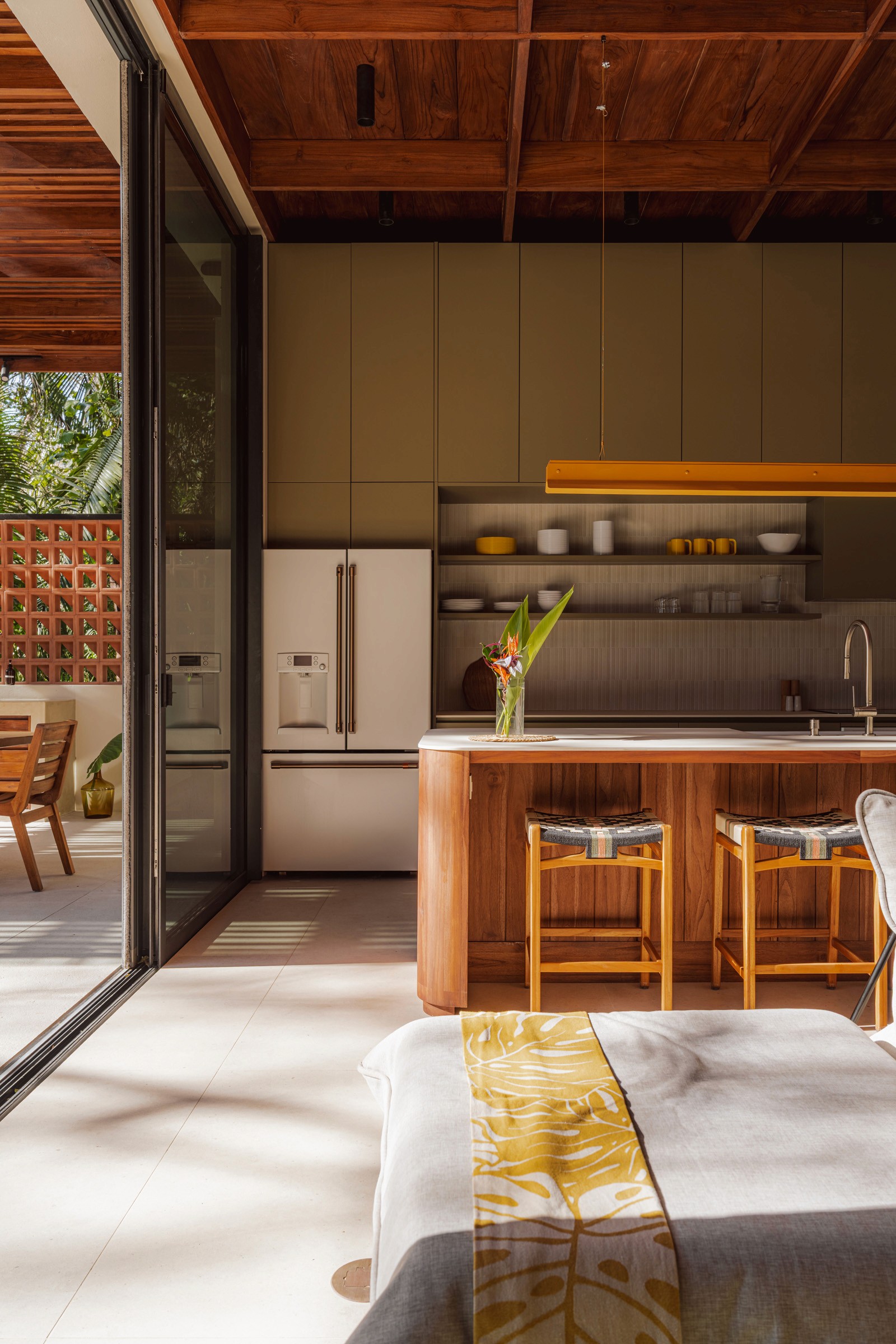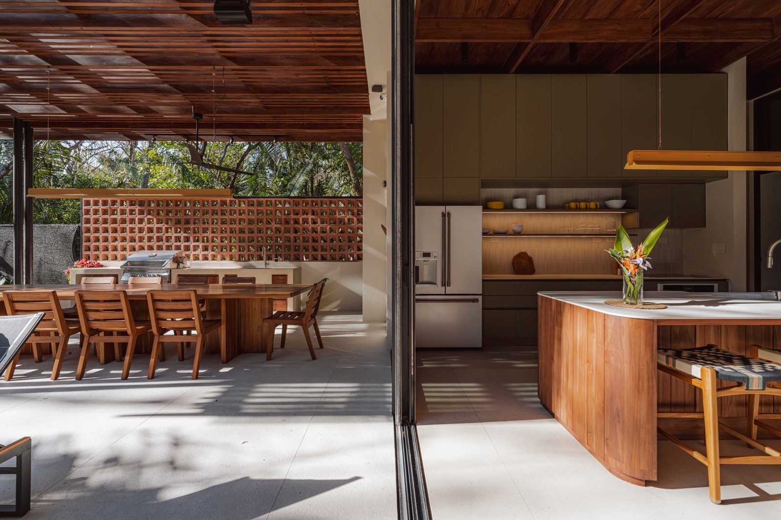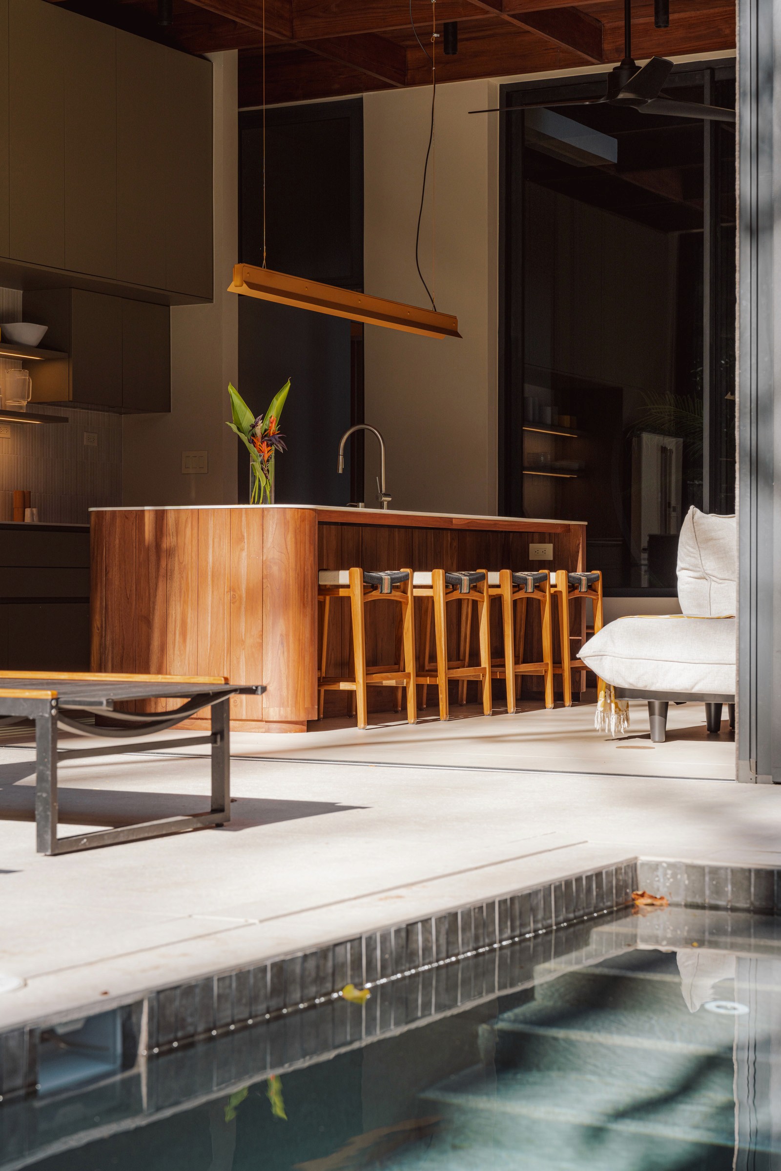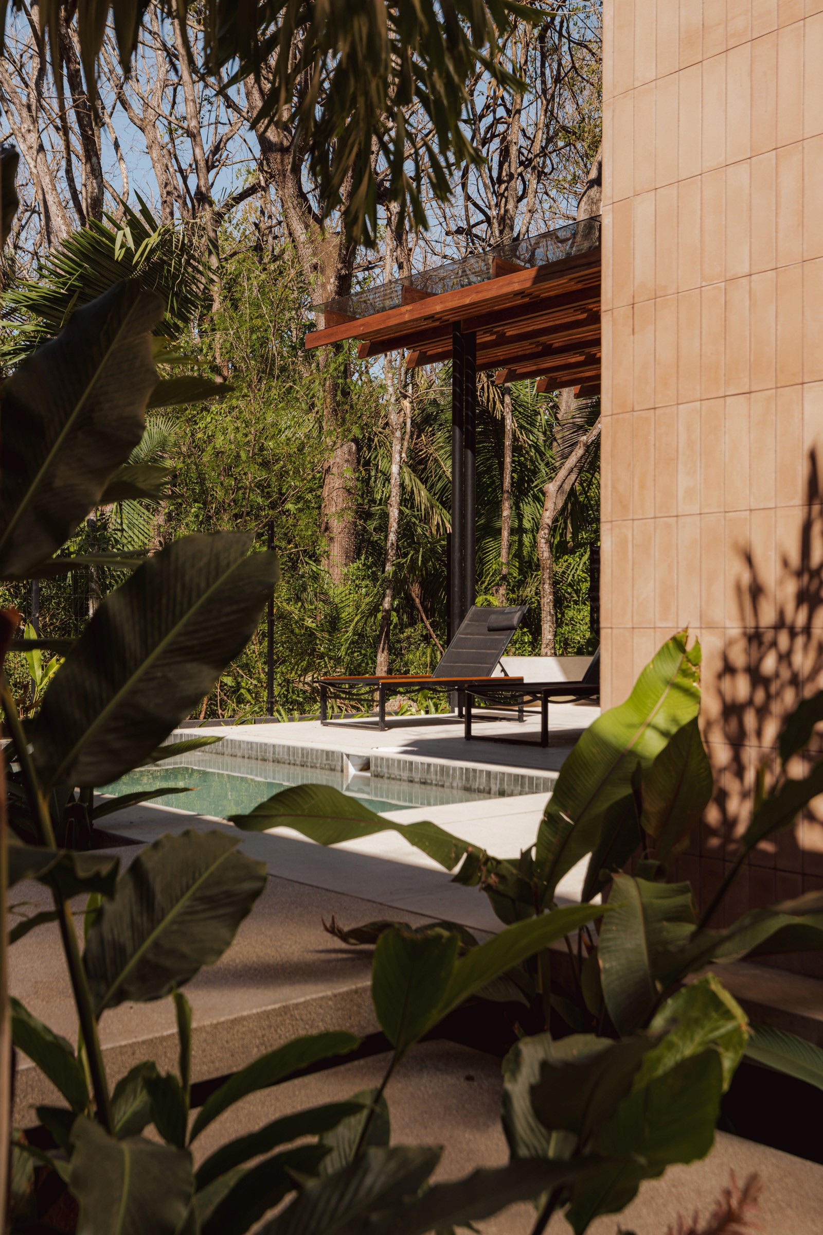 A pair of tropical homes designed to merge architecture, interiors, and landscape into one seamless experience. Two interconnected volumes balance solidity and openness, using textured masonry and vertical wood screens to frame light, breeze, and views of the surrounding forest. Taller Ken crafted the interior design with a warm, tactile palette—natural hardwoods, handcrafted tiles, terrazzo, and custom millwork—creating spaces that feel refined yet deeply connected to place. Sliding glass panels extend the social areas into shaded terraces and outdoor dining spaces, embracing Nosara’s climate and lifestyle. Casa Kallo is a relaxed, immersive retreat shaped by materiality, light, and the rhythms of coastal living.