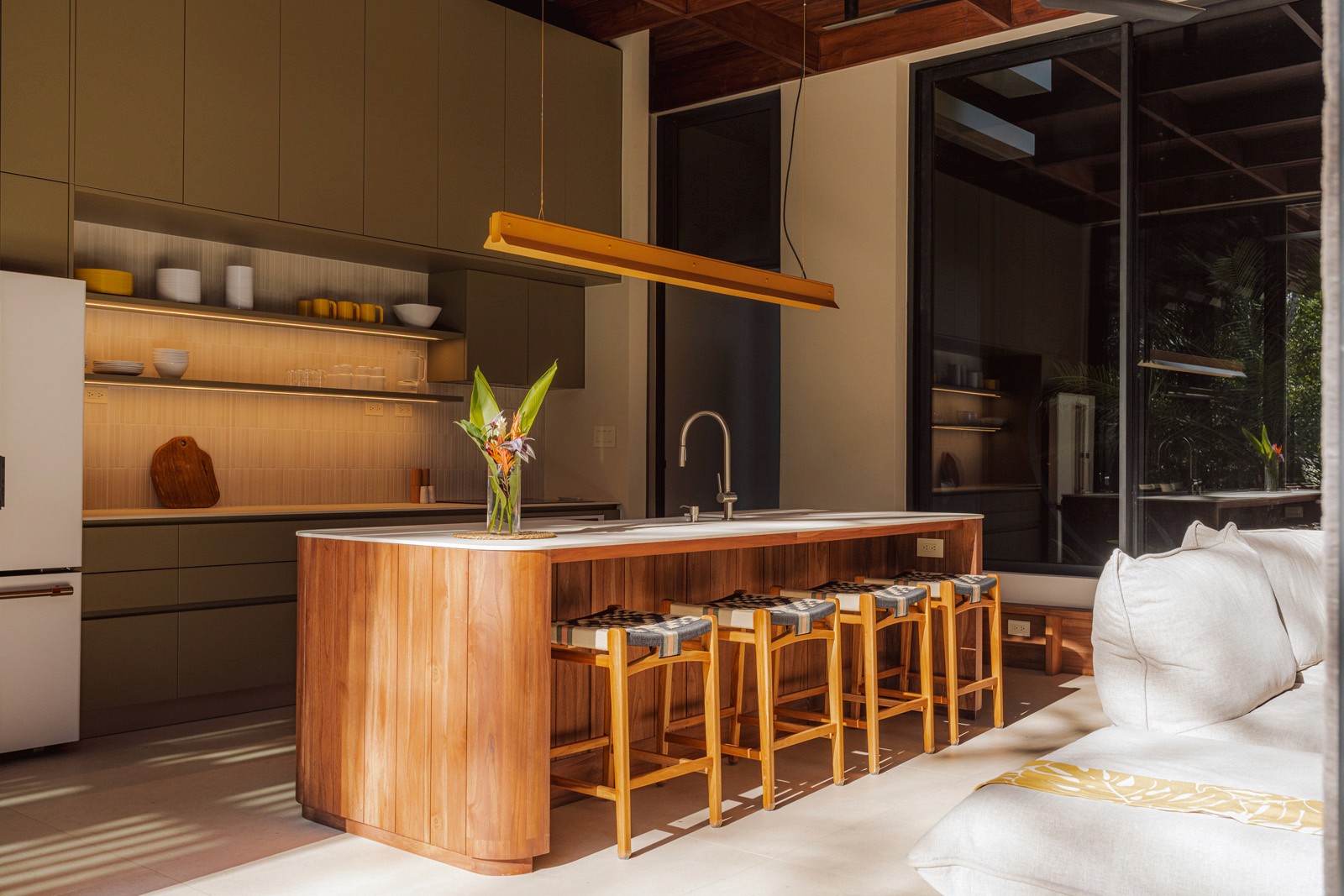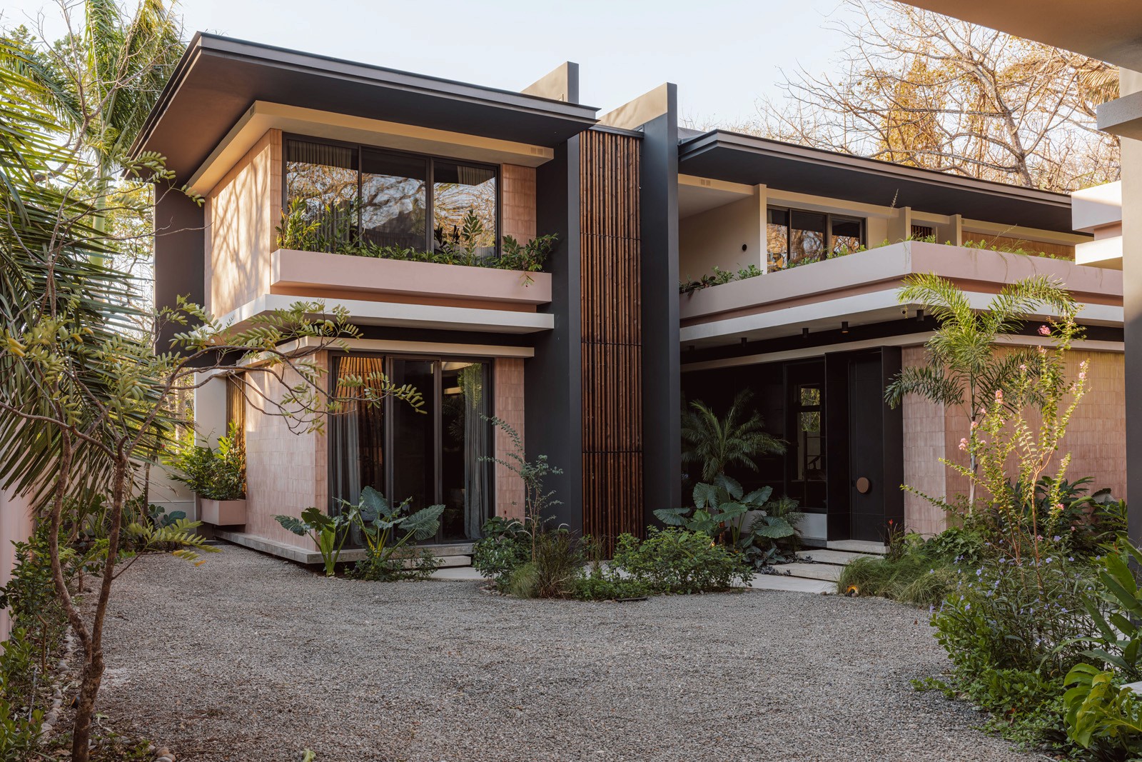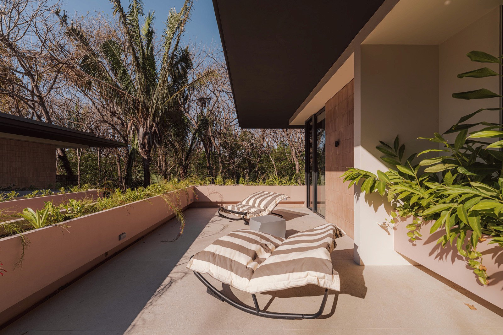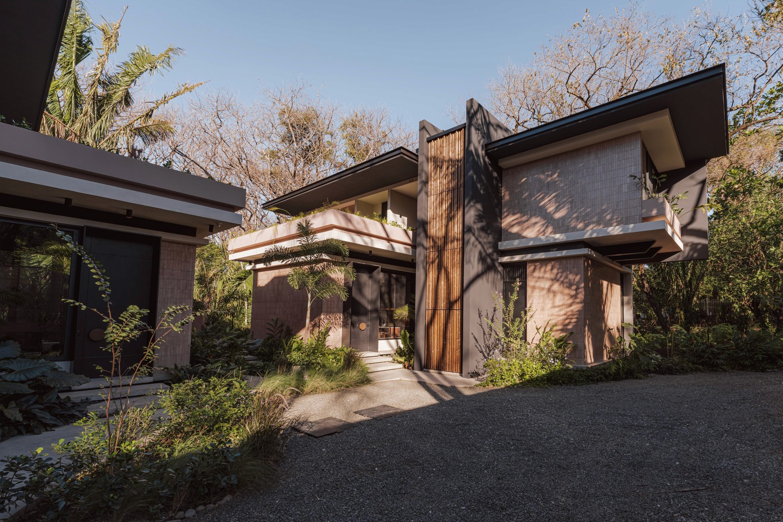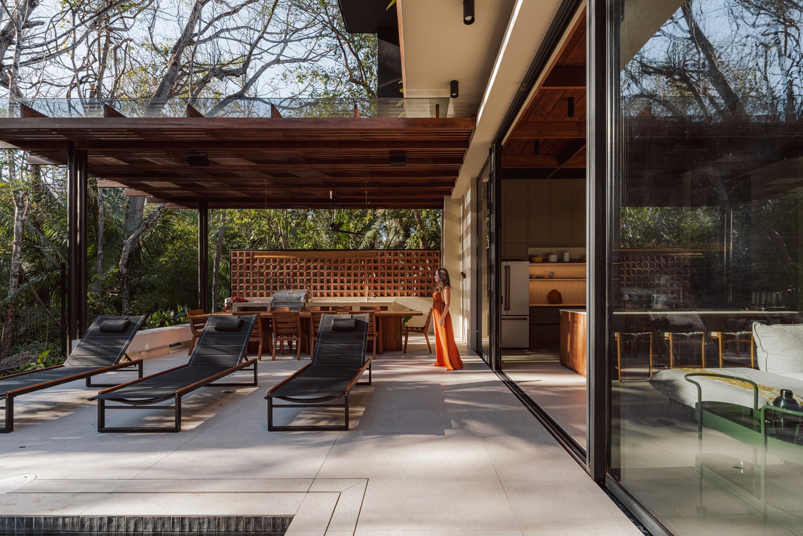 A pair of tropical homes designed to merge architecture, interiors, and landscape into one seamless experience. Two interconnected volumes balance solidity and openness, using textured masonry and vertical wood screens to frame light, breeze, and views of the surrounding forest. Taller Ken crafted the interior design with a warm, tactile palette—natural hardwoods, handcrafted tiles, terrazzo, and custom millwork—creating spaces that feel refined yet deeply connected to place. Sliding glass panels extend the social areas into shaded terraces and outdoor dining spaces, embracing Nosara’s climate and lifestyle. Casa Kallo is a relaxed, immersive retreat shaped by materiality, light, and the rhythms of coastal living.