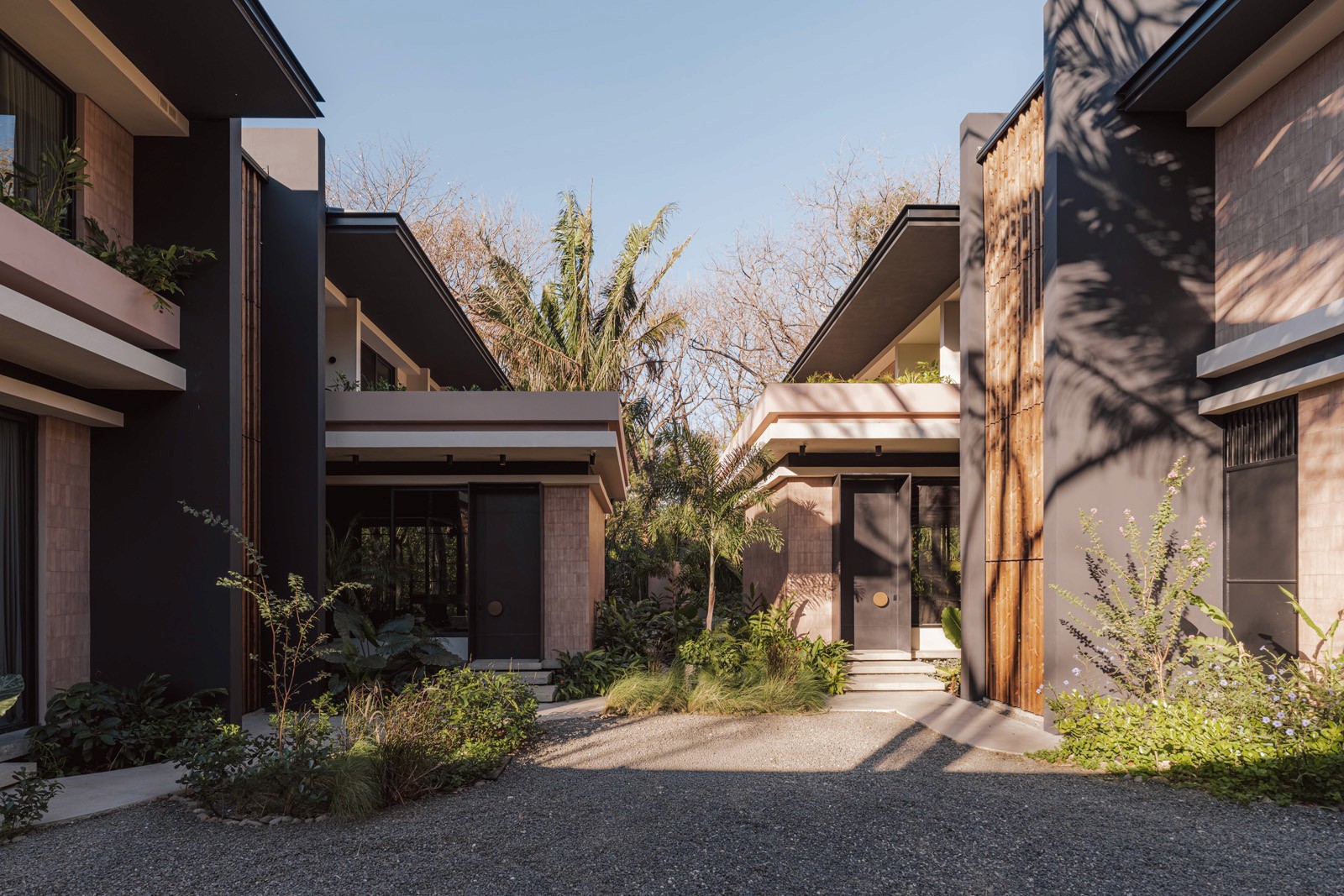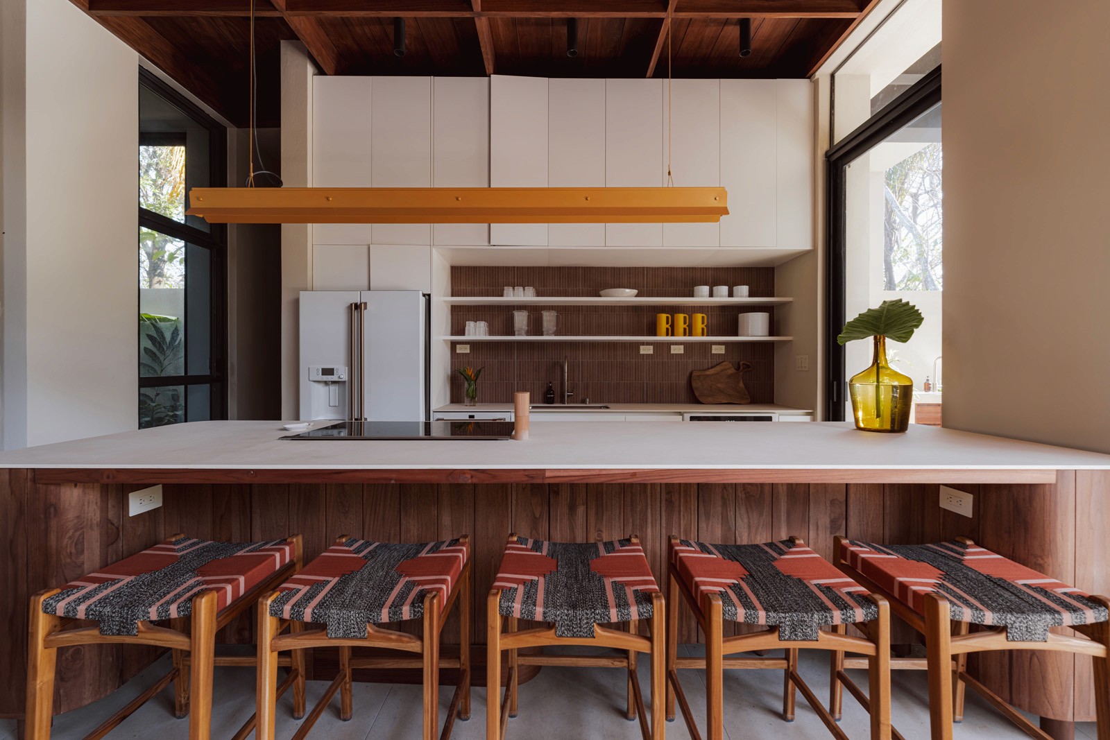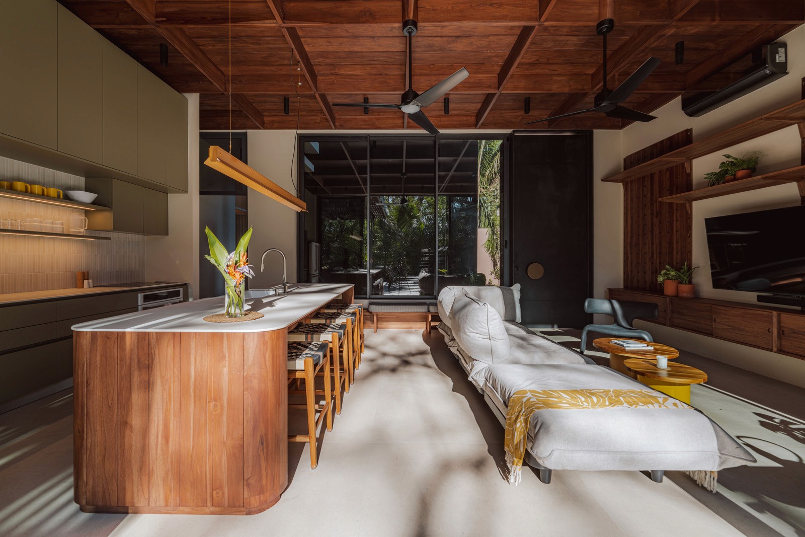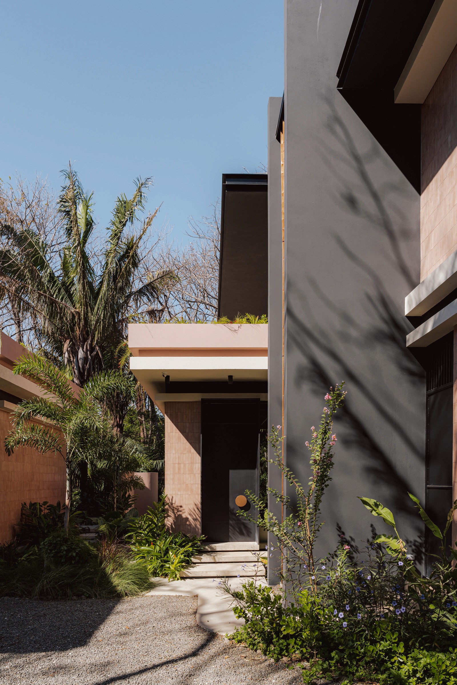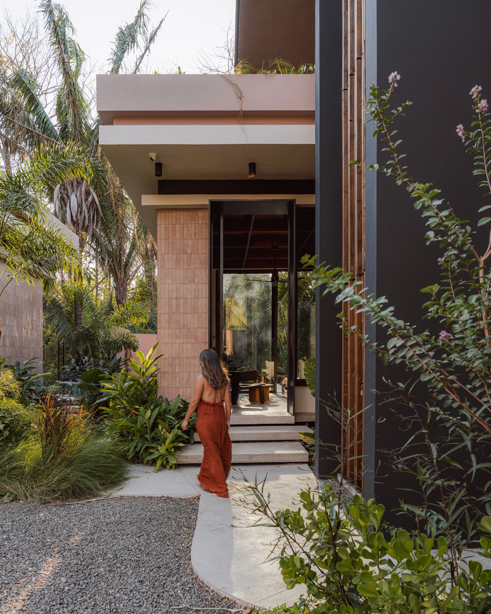 A pair of tropical homes designed to merge architecture, interiors, and landscape into one seamless experience. Two interconnected volumes balance solidity and openness, using textured masonry and vertical wood screens to frame light, breeze, and views of the surrounding forest. Taller Ken crafted the interior design with a warm, tactile palette—natural hardwoods, handcrafted tiles, terrazzo, and custom millwork—creating spaces that feel refined yet deeply connected to place. Sliding glass panels extend the social areas into shaded terraces and outdoor dining spaces, embracing Nosara’s climate and lifestyle. Casa Kallo is a relaxed, immersive retreat shaped by materiality, light, and the rhythms of coastal living.