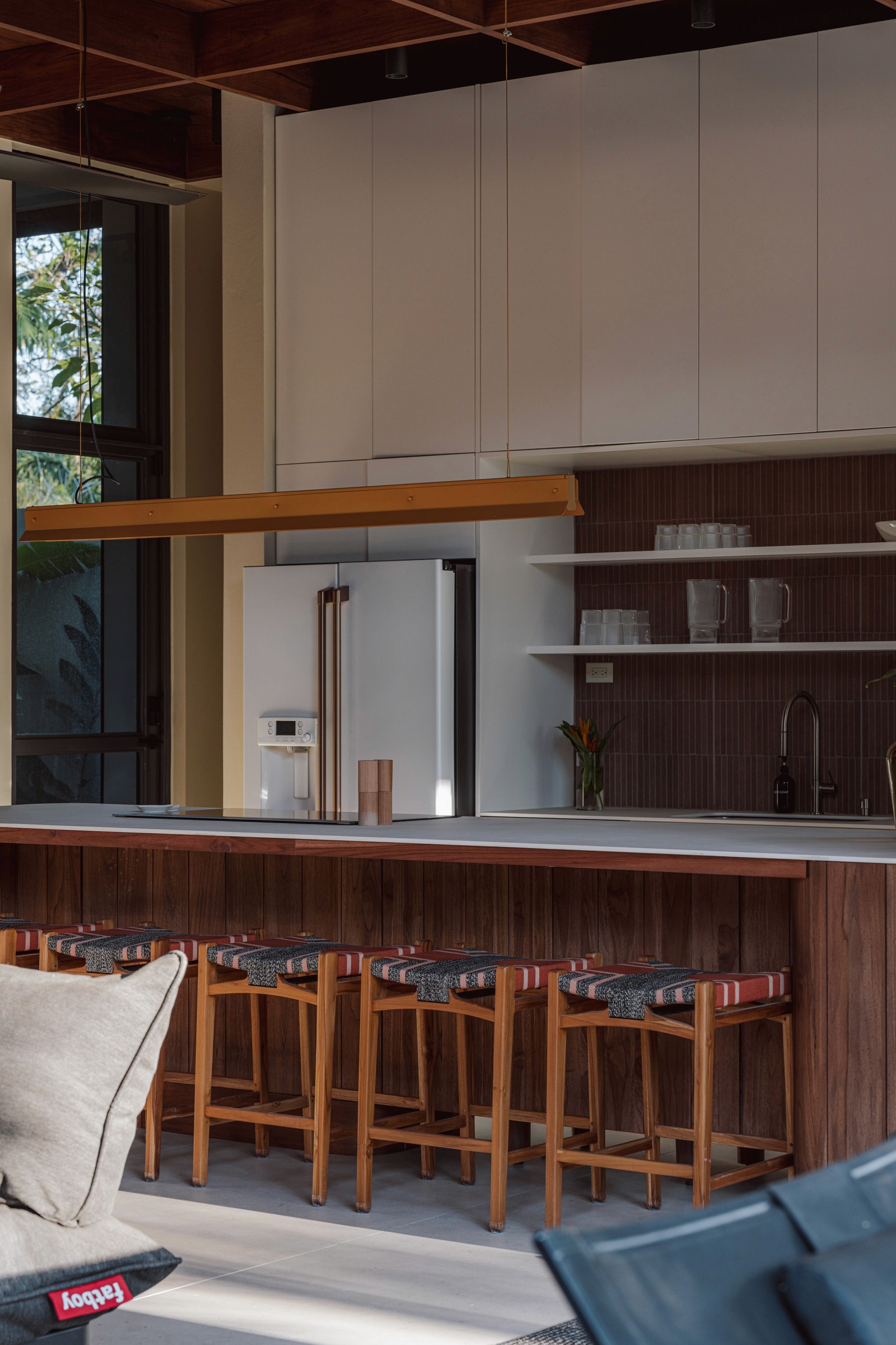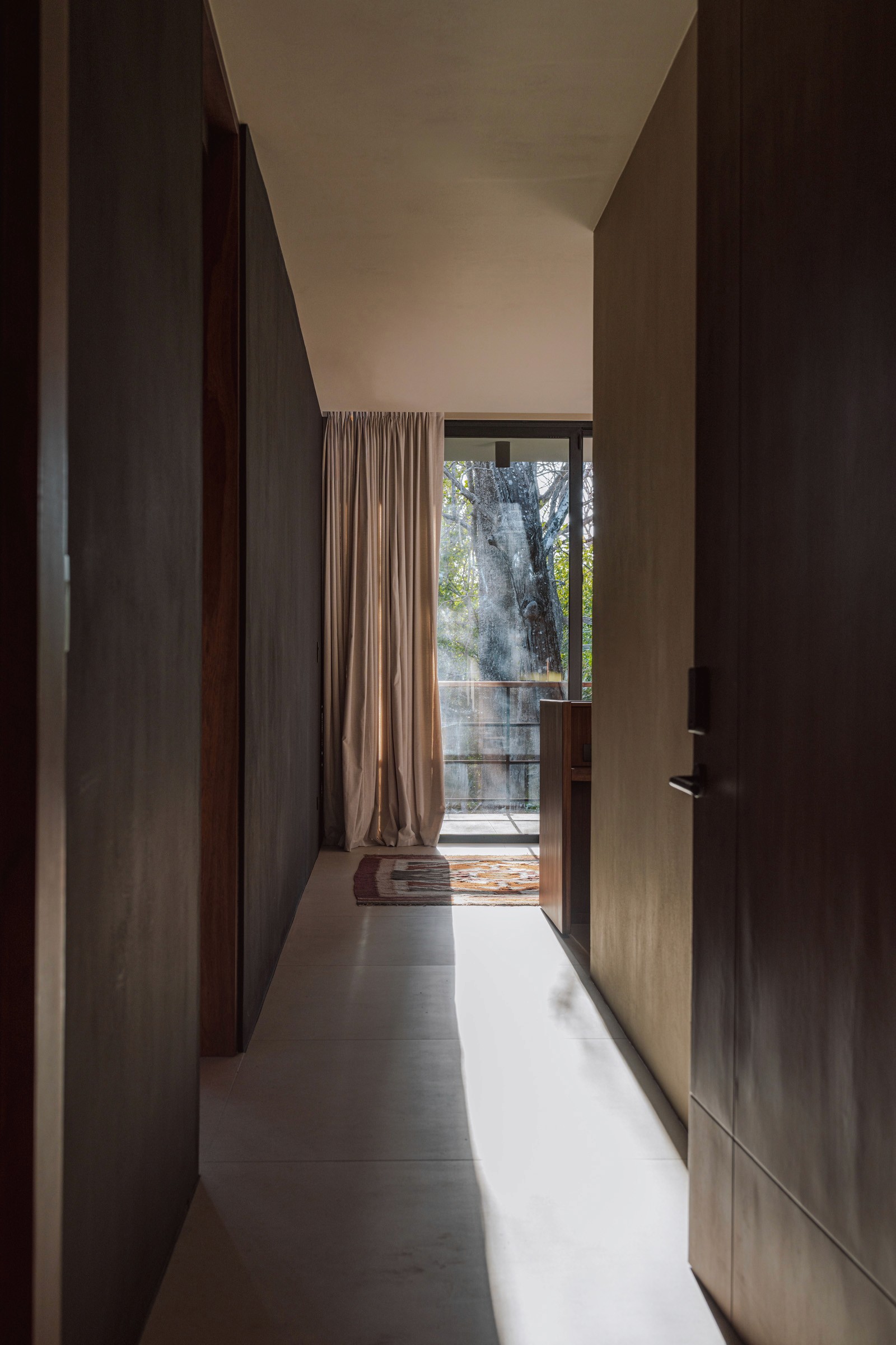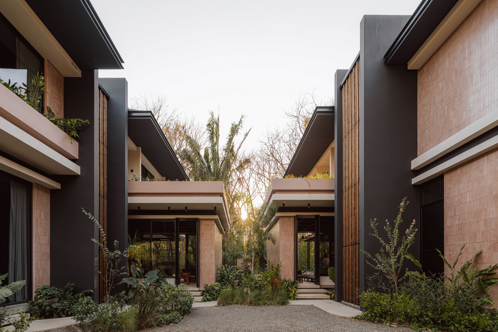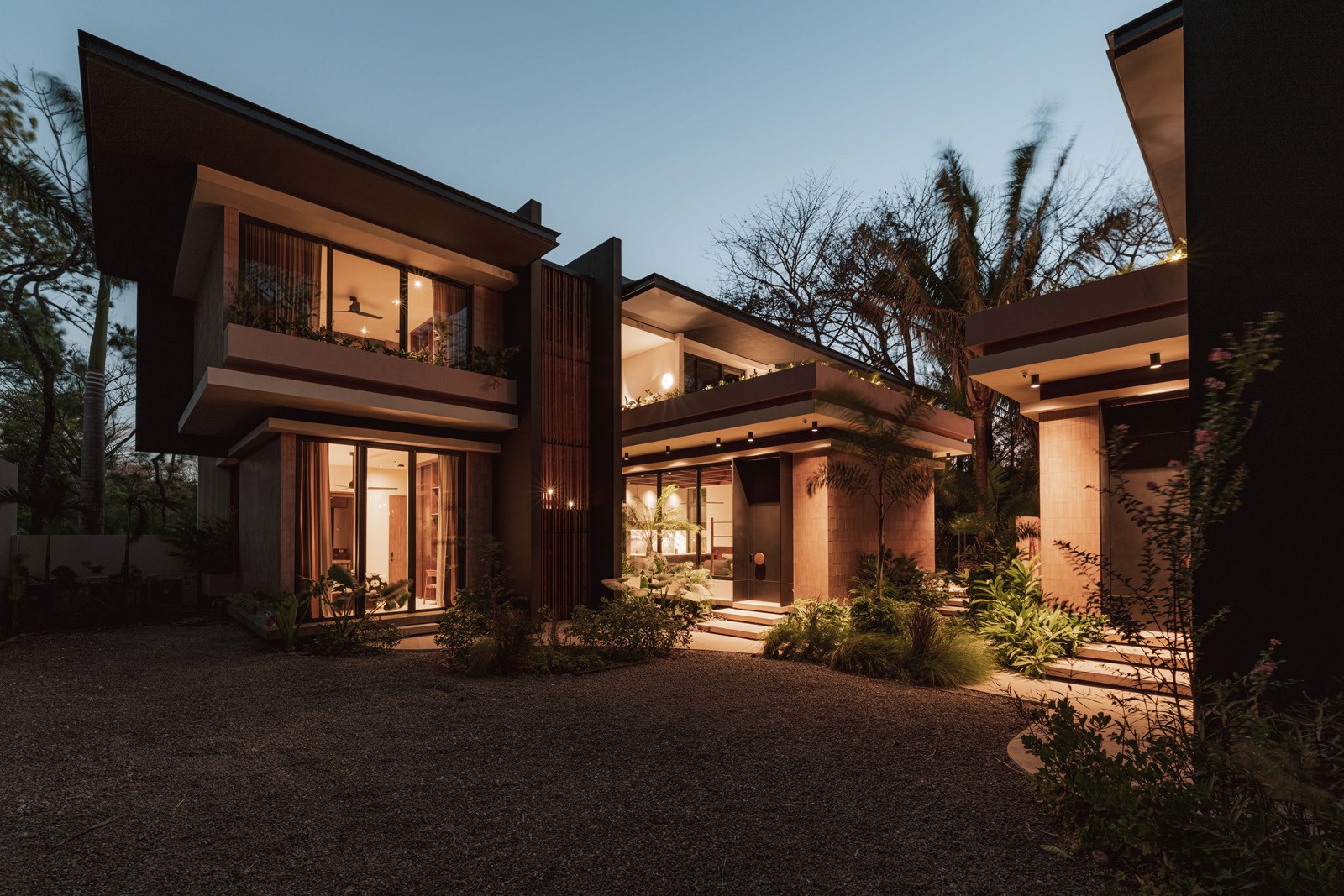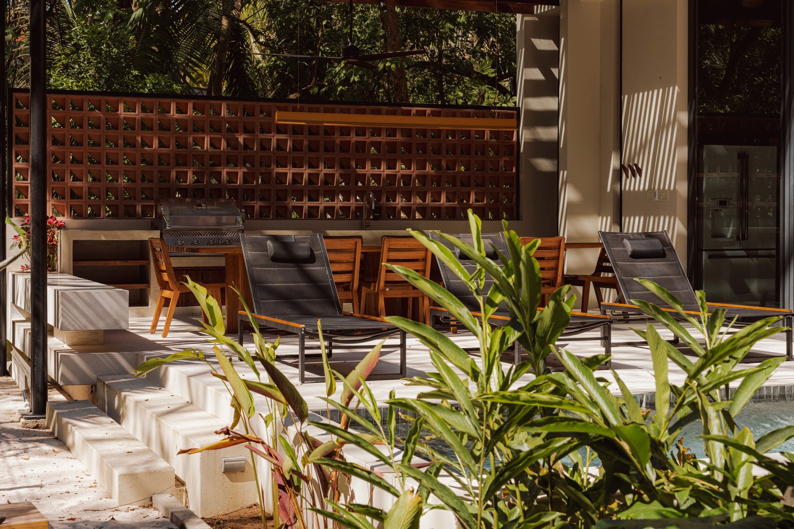 A pair of tropical homes designed to merge architecture, interiors, and landscape into one seamless experience. Two interconnected volumes balance solidity and openness, using textured masonry and vertical wood screens to frame light, breeze, and views of the surrounding forest. Taller Ken crafted the interior design with a warm, tactile palette—natural hardwoods, handcrafted tiles, terrazzo, and custom millwork—creating spaces that feel refined yet deeply connected to place. Sliding glass panels extend the social areas into shaded terraces and outdoor dining spaces, embracing Nosara’s climate and lifestyle. Casa Kallo is a relaxed, immersive retreat shaped by materiality, light, and the rhythms of coastal living.