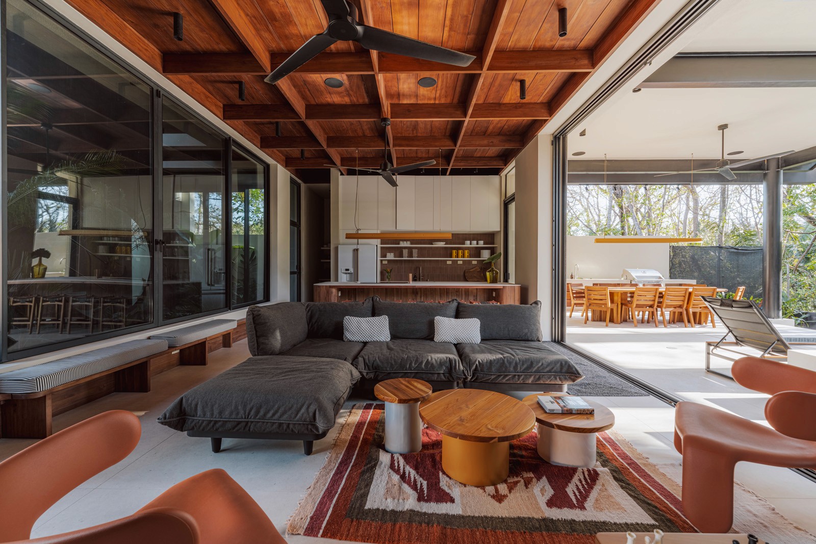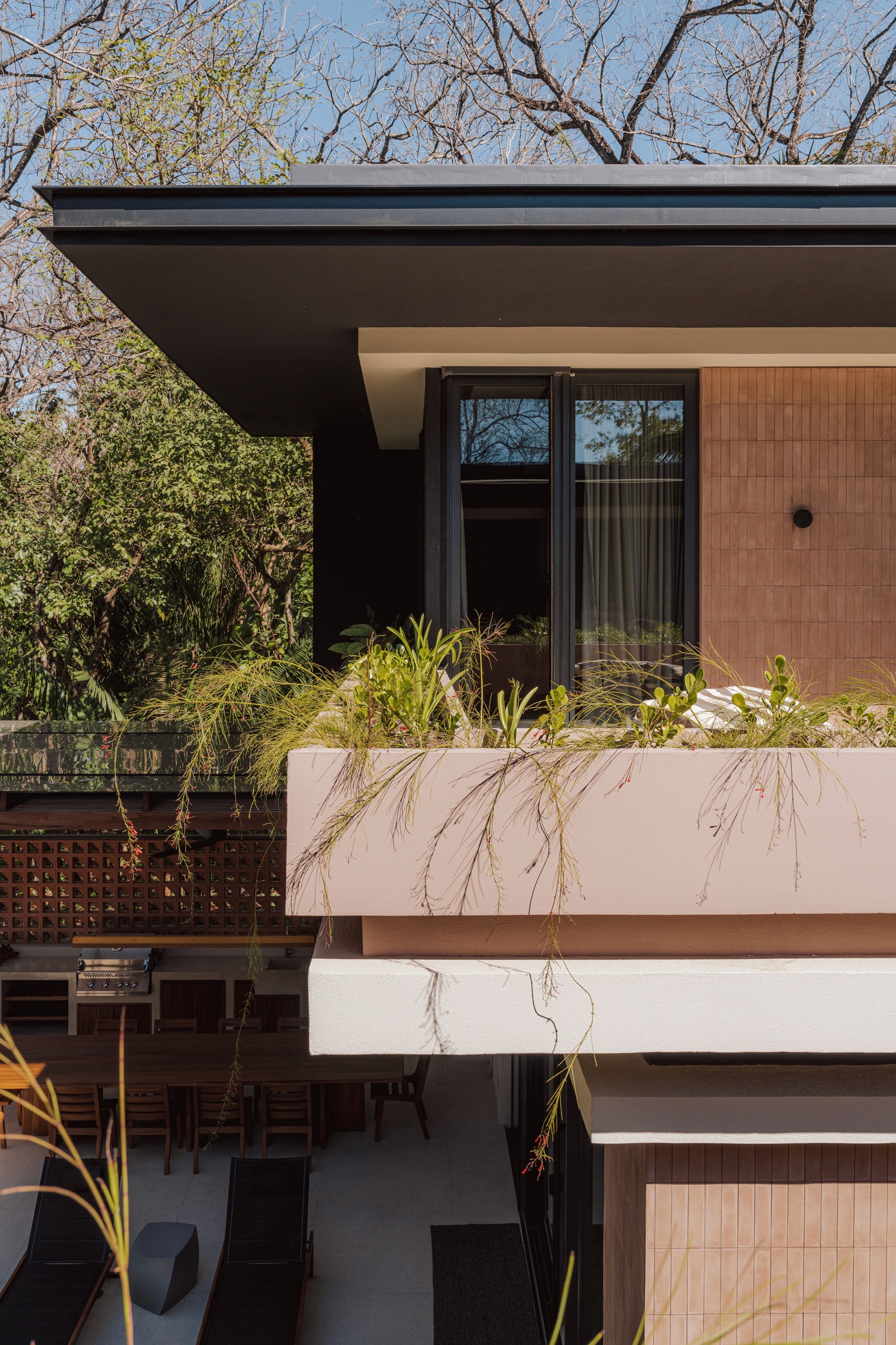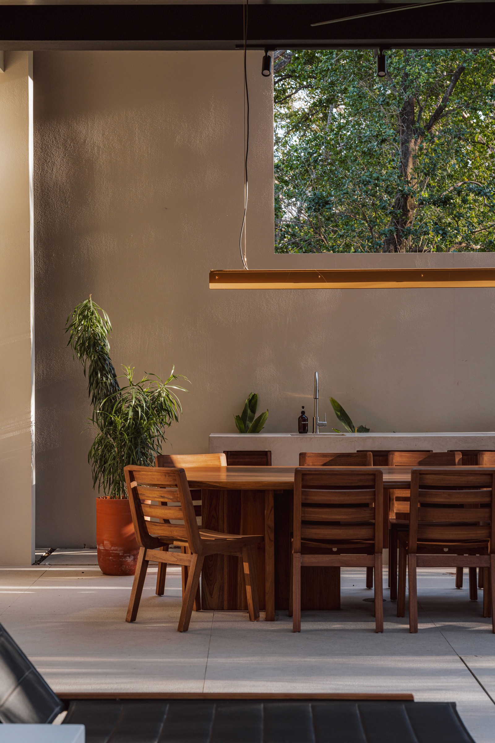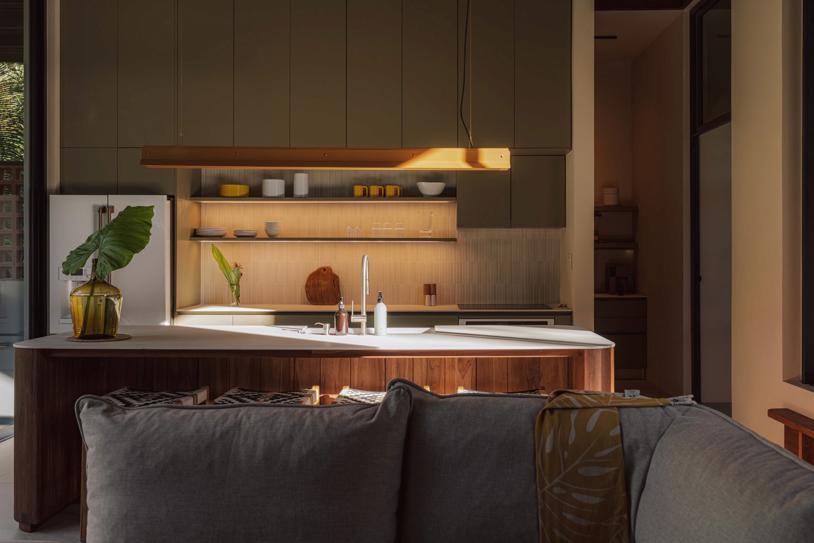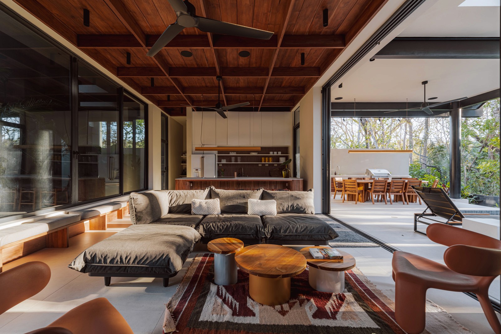 A pair of tropical homes designed to merge architecture, interiors, and landscape into one seamless experience. Two interconnected volumes balance solidity and openness, using textured masonry and vertical wood screens to frame light, breeze, and views of the surrounding forest. Taller Ken crafted the interior design with a warm, tactile palette—natural hardwoods, handcrafted tiles, terrazzo, and custom millwork—creating spaces that feel refined yet deeply connected to place. Sliding glass panels extend the social areas into shaded terraces and outdoor dining spaces, embracing Nosara’s climate and lifestyle. Casa Kallo is a relaxed, immersive retreat shaped by materiality, light, and the rhythms of coastal living.
