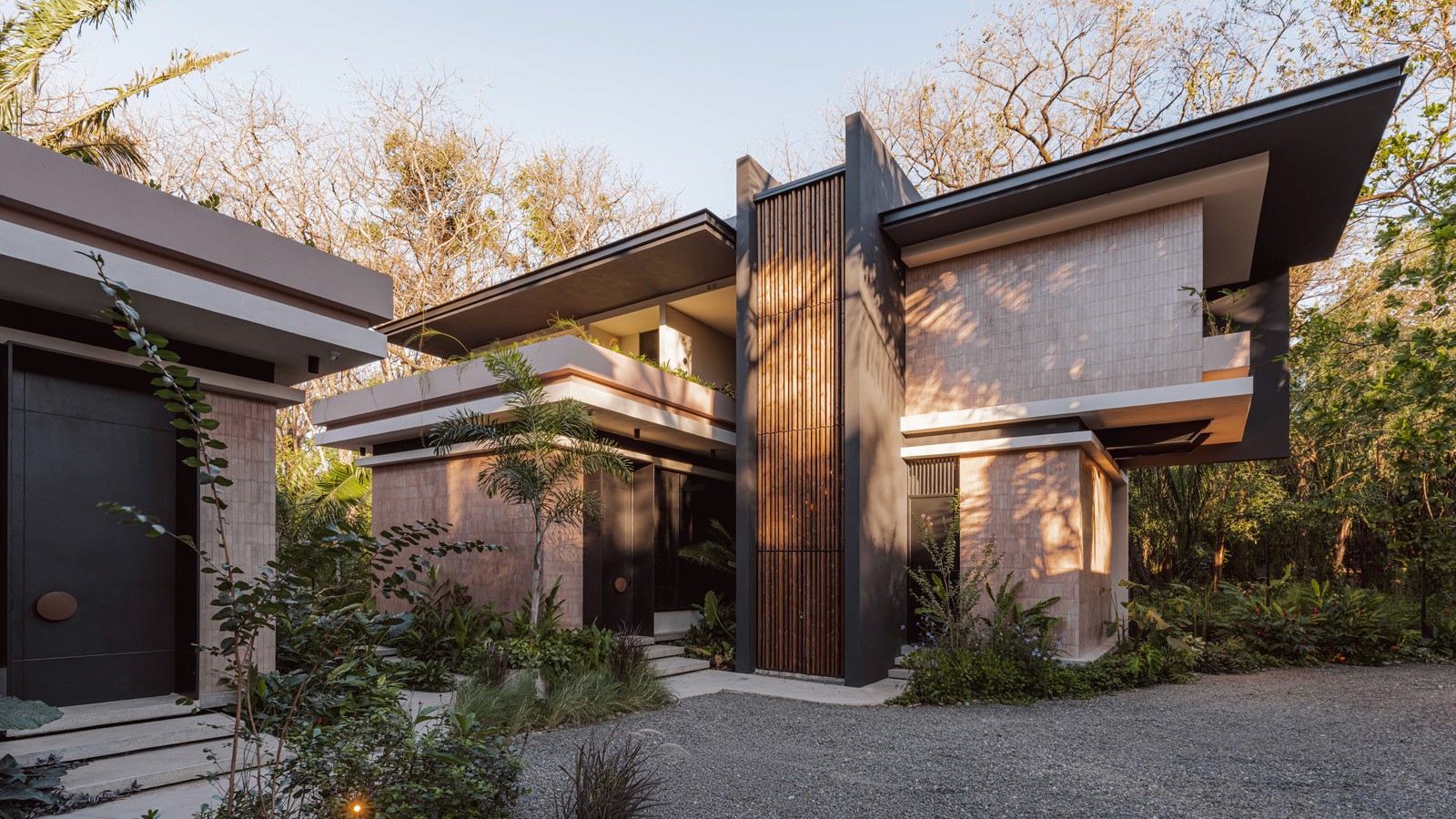 Architecture by Instinto Estudio | Interior Design by Taller Ken Nosara, Guanacaste, Costa Rica Casa Kallo is a pair of tropical homes designed to merge architecture, interiors, and landscape into one seamless experience. Two interconnected volumes balance solidity and openness, using textured masonry and vertical wood screens to frame light, breeze, and views of the surrounding forest. Taller Ken crafted the interior design with a warm, tactile palette—natural hardwoods, handcrafted tiles, terrazzo, and custom millwork—creating spaces that feel refined yet deeply connected to place. Sliding glass panels extend the social areas into shaded terraces and outdoor dining spaces, embracing Nosara’s climate and lifestyle. Casa Kallo is a relaxed, immersive retreat shaped by materiality, light, and the rhythms of coastal living.