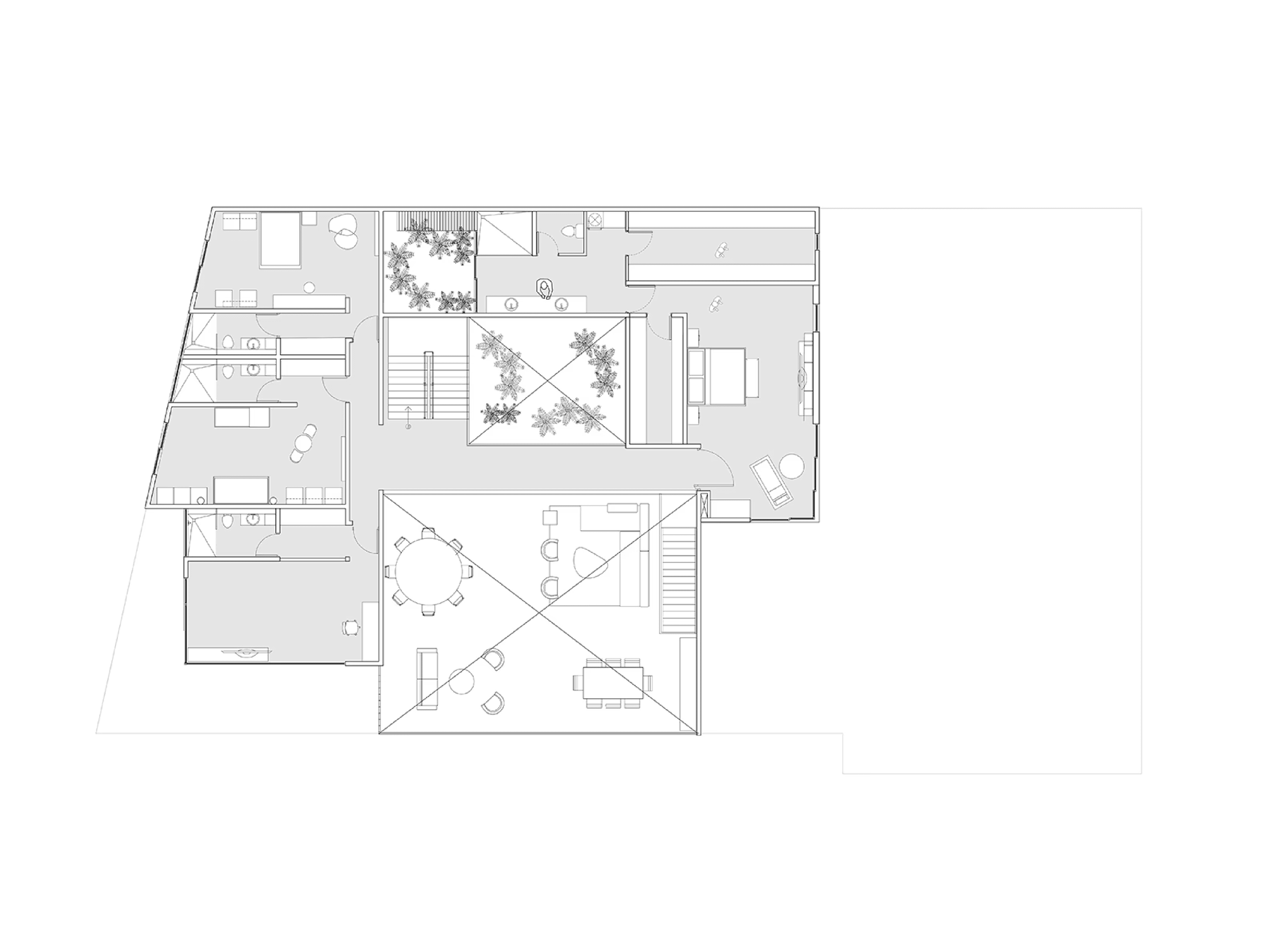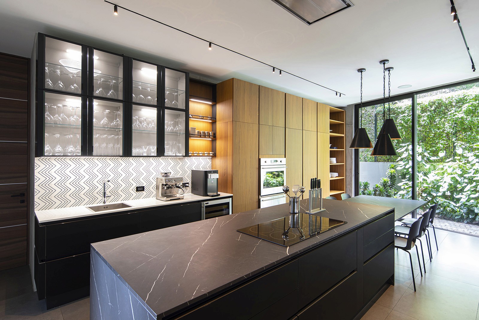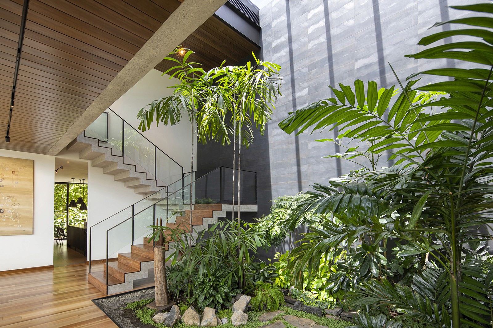 Within the dwelling, interiors are arranged to keep the focus on exterior views. Earthy materials such as slate, wood and marble help tie the home to its site. "The refined material palette and curated furnishings draw attention to the natural surroundings, bringing greenery into the interiors of the home," said Taller KEN. The ground floor encompasses an open-plan living and dining area, an adjoining kitchen, a small bedroom, and laundry facilities. In the kitchen, the team incorporated porcelain tile flooring and an island topped with Nero Marquina marble, with side counters made of a white quartz composite. Cabinets have a black lacquer finish or walnut veneer. Backsplashes are covered with black-and-white tiles with a zig-zag pattern. The double-height living space features tile flooring, leather sofas and a wood-and-metal coffee table. The airy room is "dominated by the long, arching line of a tropical plant that reaches up toward iroko wood ceilings" added the studio. Just off the lounge area is an indoor garden filled with lush plants, including the pacaya palm and several umbrella plants. The courtyard is surrounded by walls wrapped in grey porcelain tiles. A stretch of skylights brings in natural light. "Here, in contrast within its minimal surrounds, nature is presented as a striking sculptural statement," the team said.