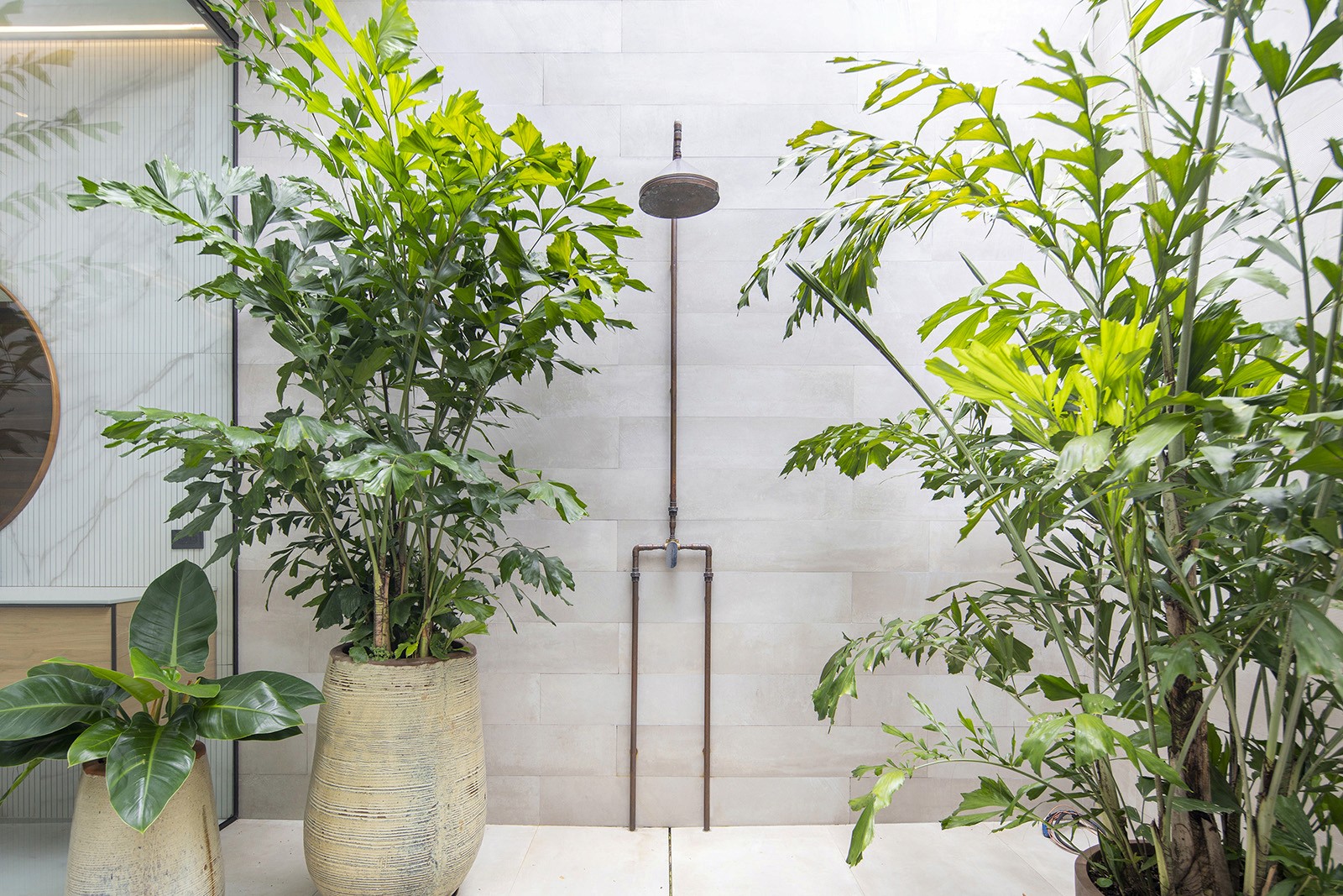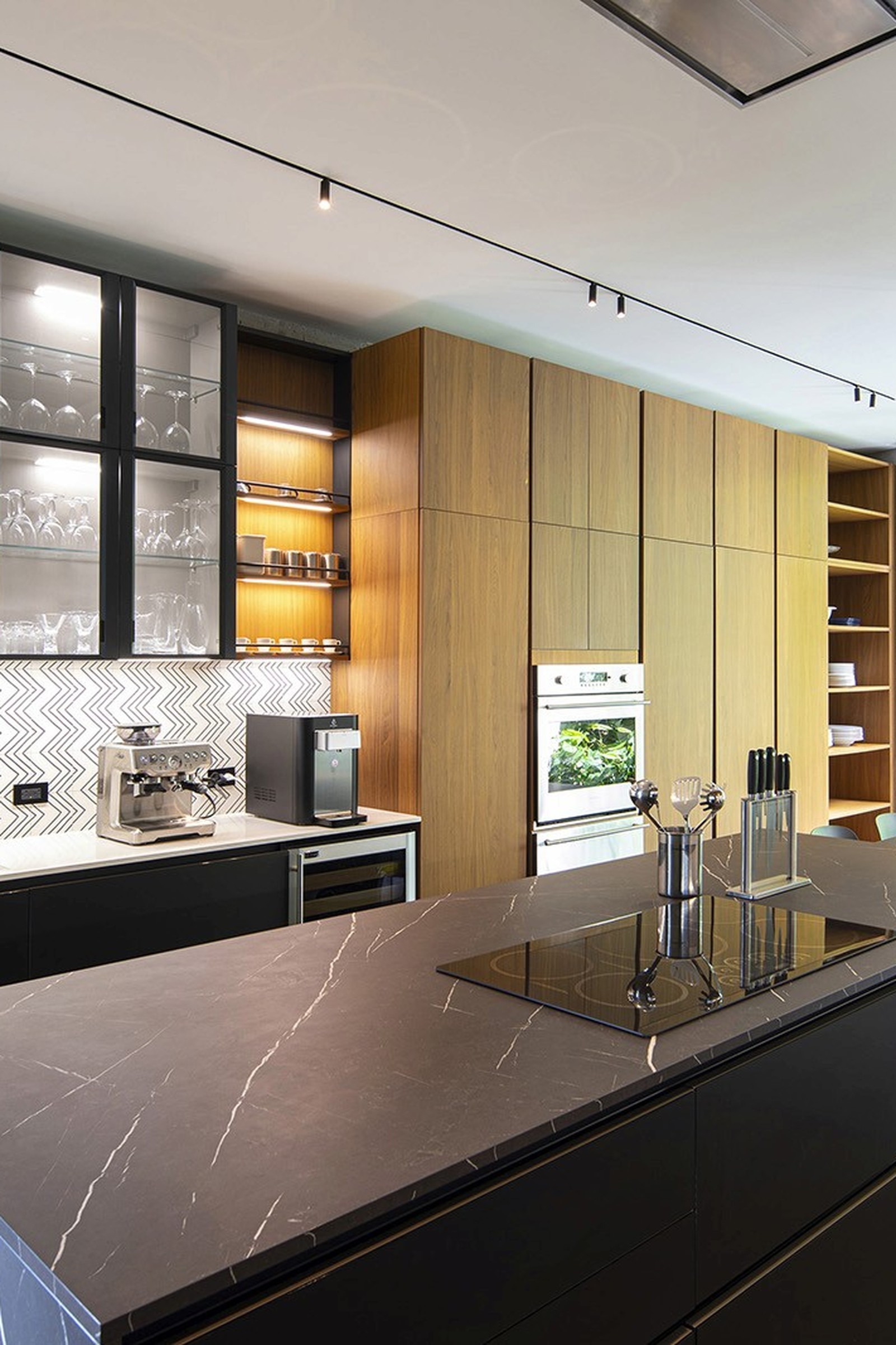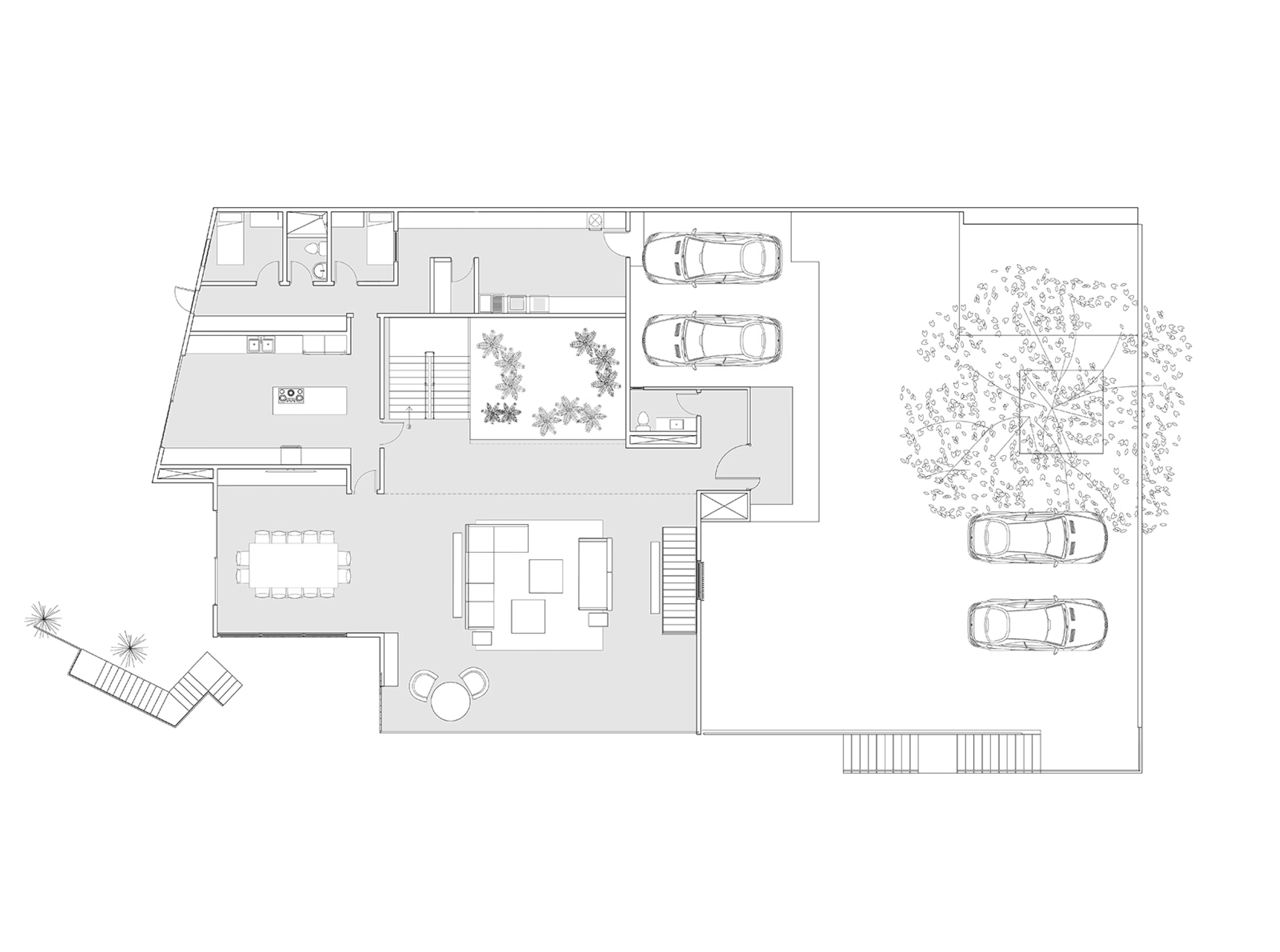 Within the dwelling, interiors are arranged to keep the focus on exterior views. Earthy materials such as slate, wood and marble help tie the home to its site. "The refined material palette and curated furnishings draw attention to the natural surroundings, bringing greenery into the interiors of the home," said Taller KEN. The ground floor encompasses an open-plan living and dining area, an adjoining kitchen, a small bedroom, and laundry facilities. In the kitchen, the team incorporated porcelain tile flooring and an island topped with Nero Marquina marble, with side counters made of a white quartz composite. Cabinets have a black lacquer finish or walnut veneer. Backsplashes are covered with black-and-white tiles with a zig-zag pattern. The double-height living space features tile flooring, leather sofas and a wood-and-metal coffee table. The airy room is "dominated by the long, arching line of a tropical plant that reaches up toward iroko wood ceilings" added the studio. Just off the lounge area is an indoor garden filled with lush plants, including the pacaya palm and several umbrella plants. The courtyard is surrounded by walls wrapped in grey porcelain tiles. A stretch of skylights brings in natural light. "Here, in contrast within its minimal surrounds, nature is presented as a striking sculptural statement," the team said.