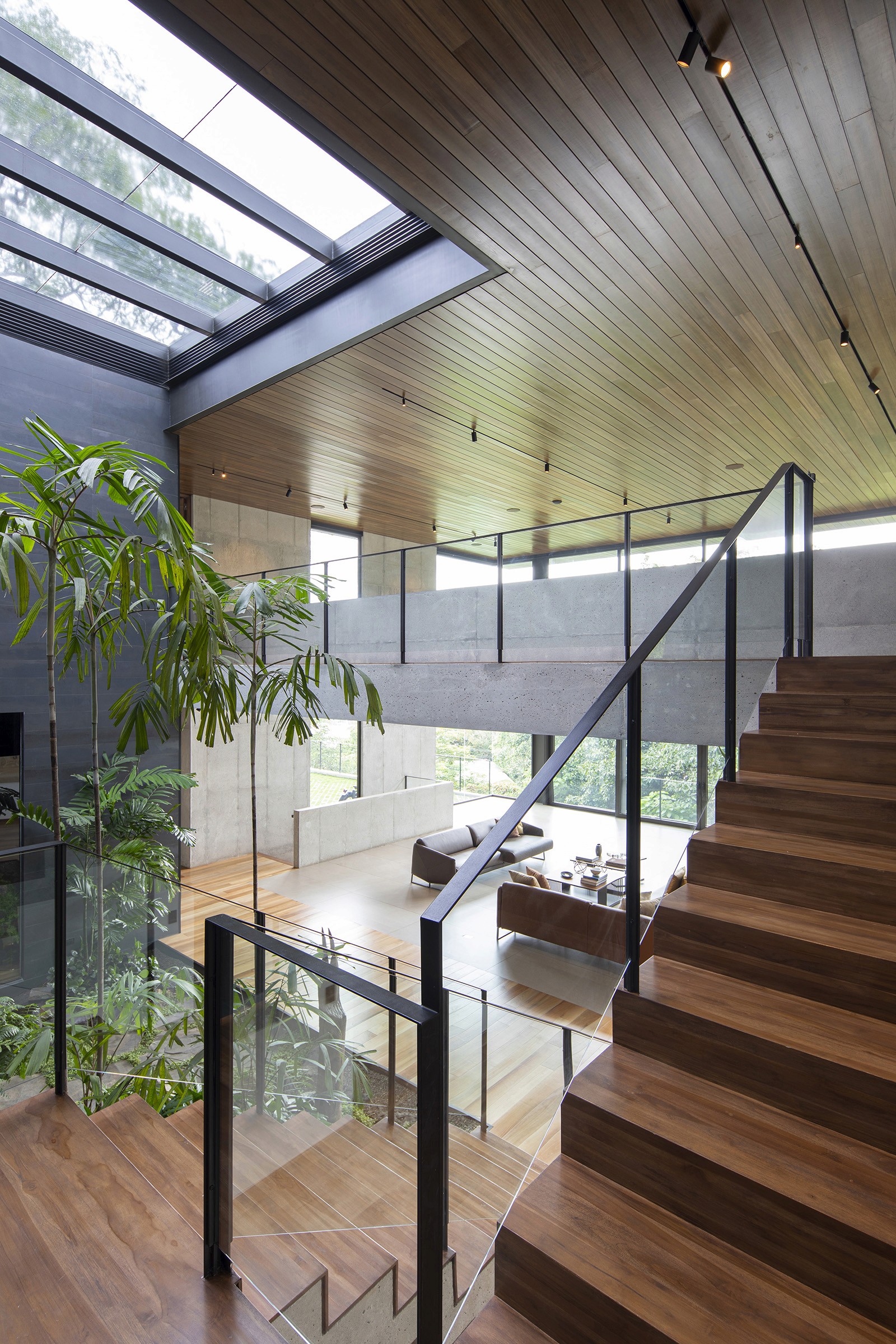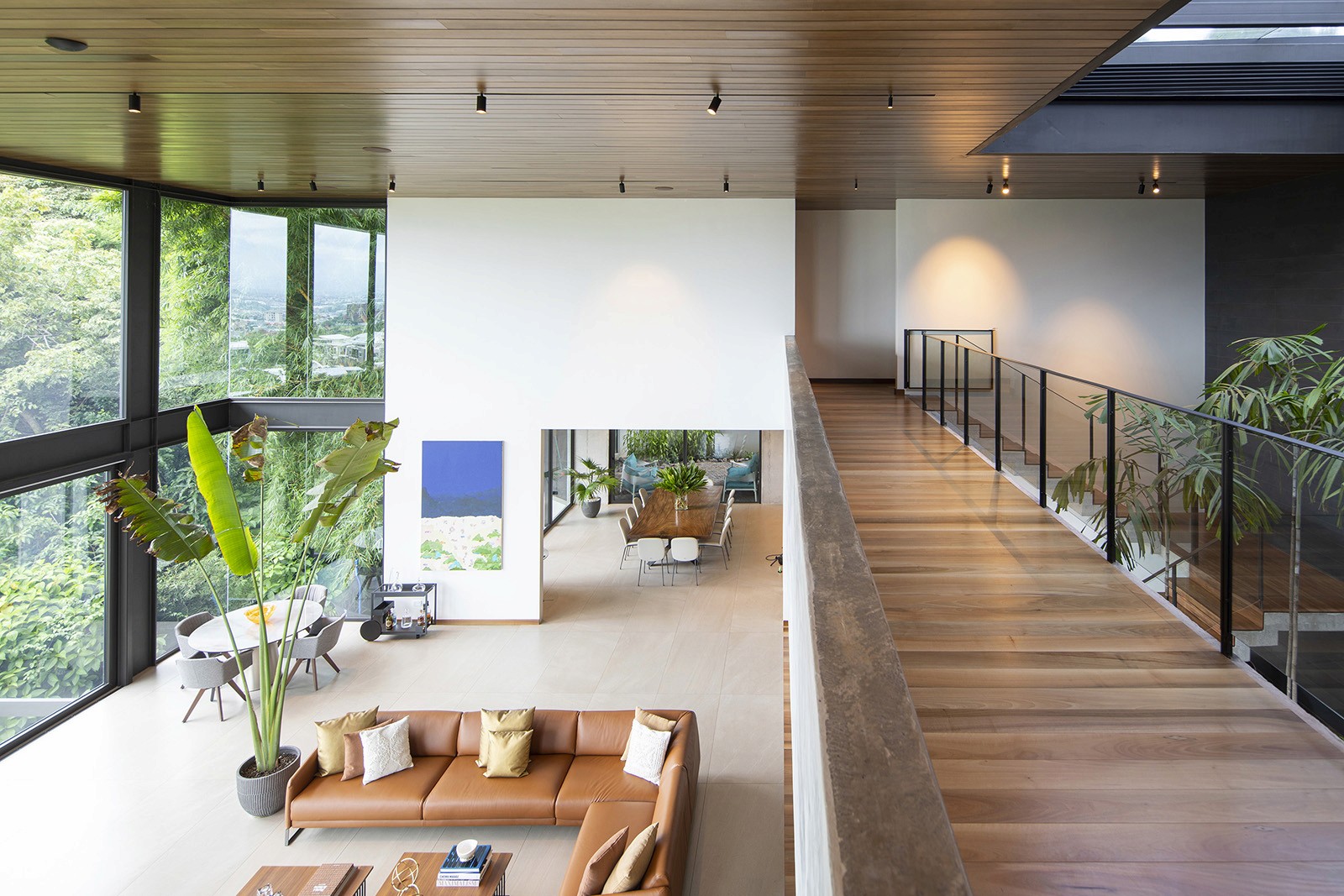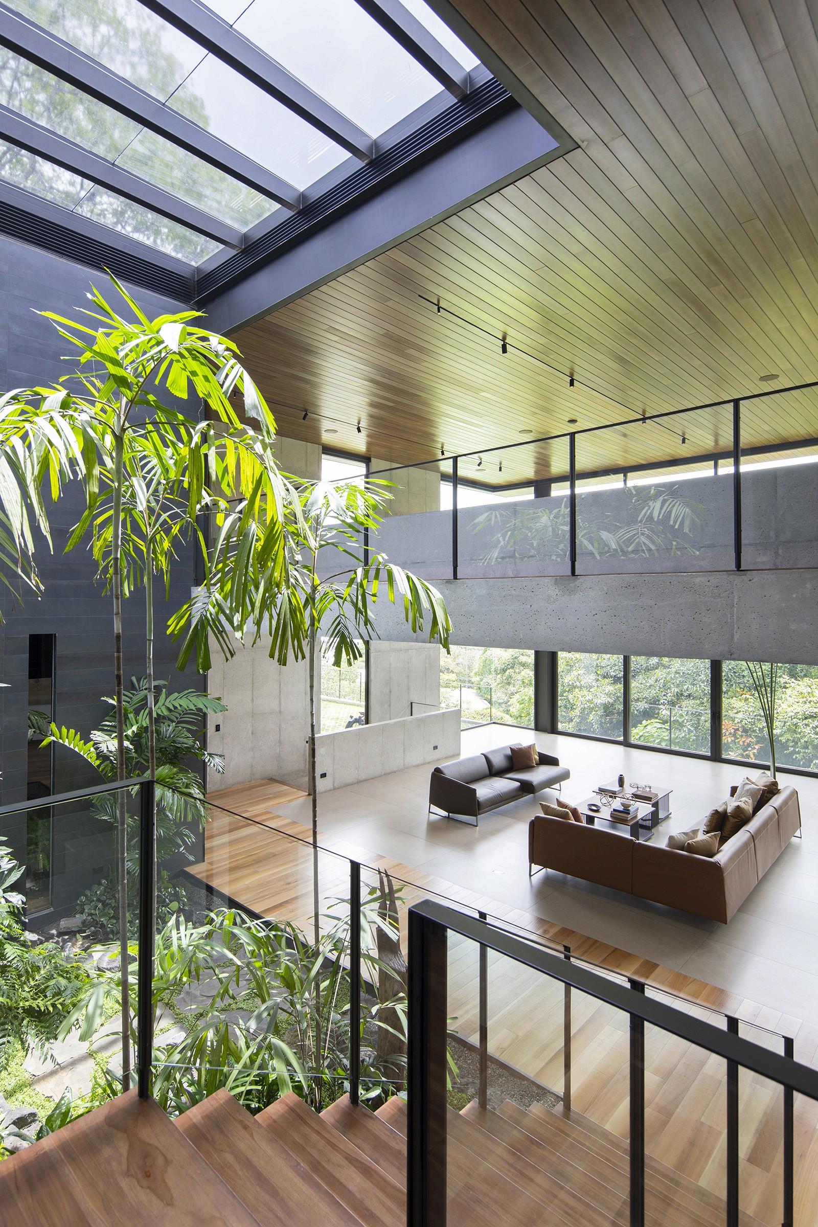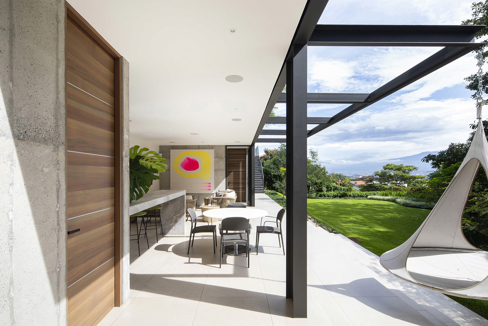 The residence was designed by local firm Zürcher Arquitectos, while the interior design was overseen by Taller KEN, which has offices in San José, Guatemala City and New York. It was created for a couple – Hector Anchia and Indiana Trejos – and their three young boys. Anchia is the owner of two companies: Kamalio, a retailer of furniture and finishes, and AIE Construction, which built the house.Encompassing 743 square metres, the rectilinear home rises three levels. Exterior walls are made of poured-in-place concrete, with steel framing incorporated into certain areas. Generous windows frame expansive views of the terrain, while deep overhangs provide shade. Warm-toned iroko wood wraps the underside of the roof eaves. Encompassing 743 square metres, the rectilinear home rises three levels. Exterior walls are made of poured-in-place concrete, with steel framing incorporated into certain areas. Generous windows frame expansive views of the terrain, while deep overhangs provide shade. Warm-toned iroko wood wraps the underside of the roof eaves.