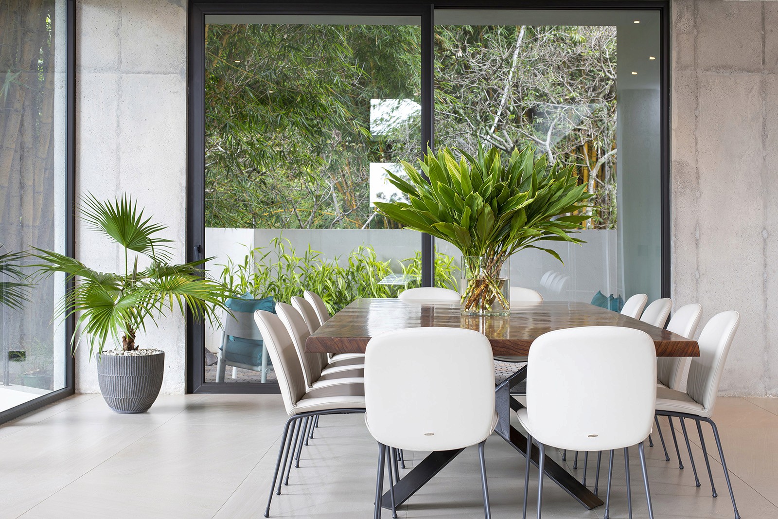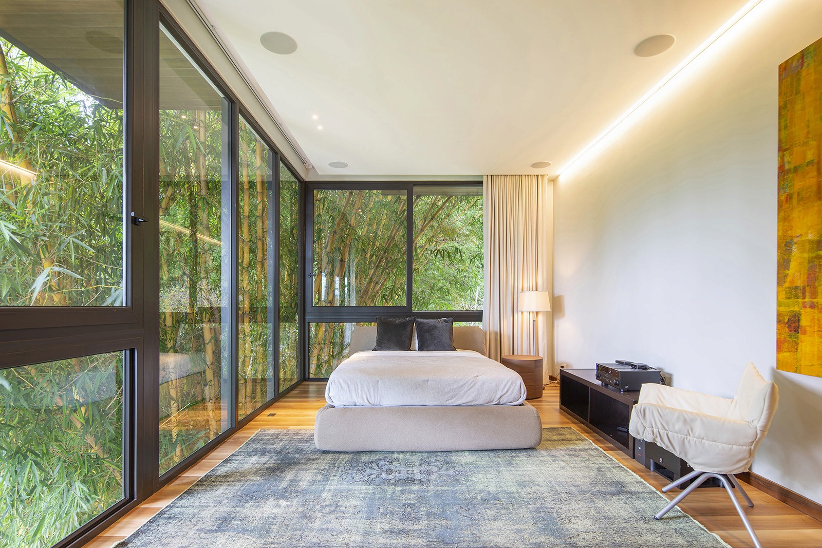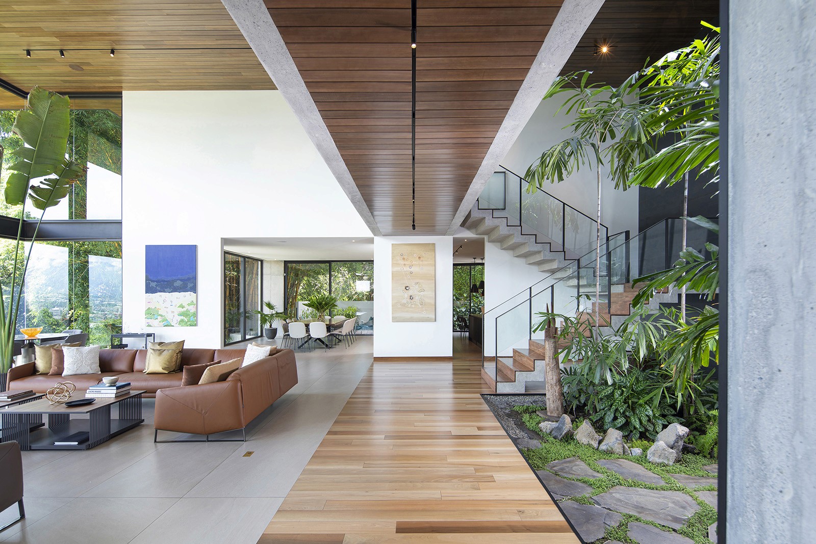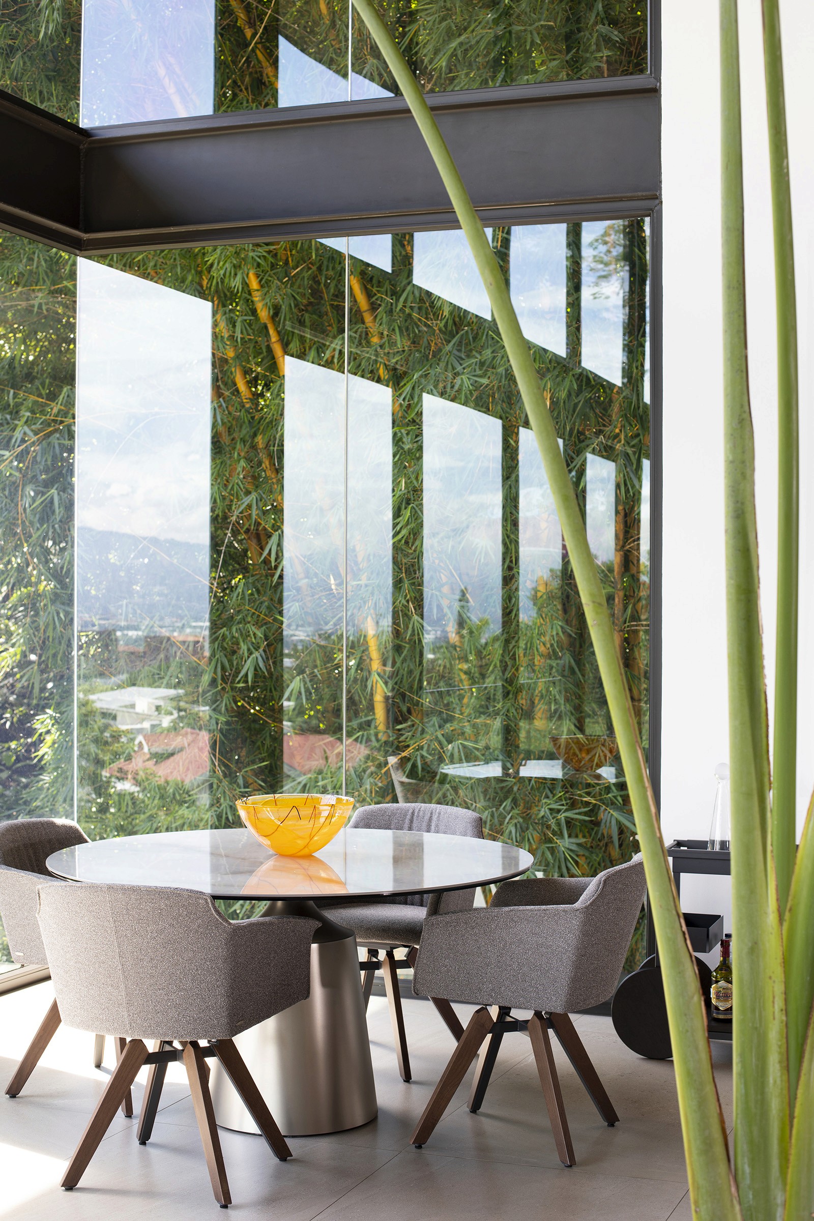 The residence was designed by local firm Zürcher Arquitectos, while the interior design was overseen by Taller KEN, which has offices in San José, Guatemala City and New York. It was created for a couple – Hector Anchia and Indiana Trejos – and their three young boys. Anchia is the owner of two companies: Kamalio, a retailer of furniture and finishes, and AIE Construction, which built the house.Encompassing 743 square metres, the rectilinear home rises three levels. Exterior walls are made of poured-in-place concrete, with steel framing incorporated into certain areas. Generous windows frame expansive views of the terrain, while deep overhangs provide shade. Warm-toned iroko wood wraps the underside of the roof eaves. Encompassing 743 square metres, the rectilinear home rises three levels. Exterior walls are made of poured-in-place concrete, with steel framing incorporated into certain areas. Generous windows frame expansive views of the terrain, while deep overhangs provide shade. Warm-toned iroko wood wraps the underside of the roof eaves.