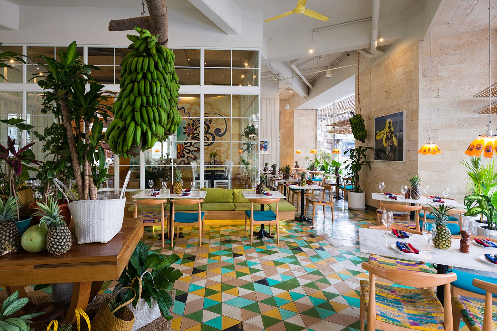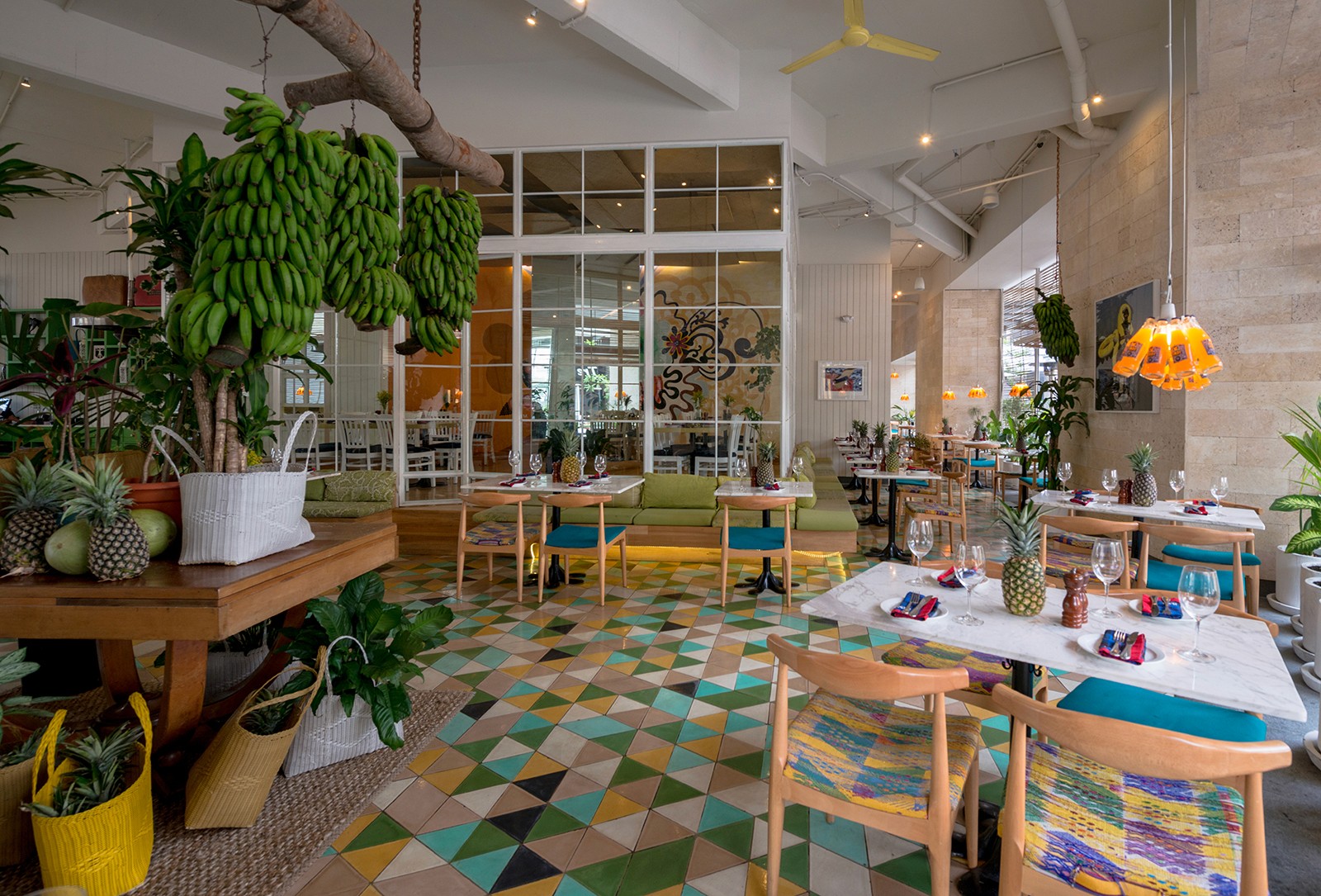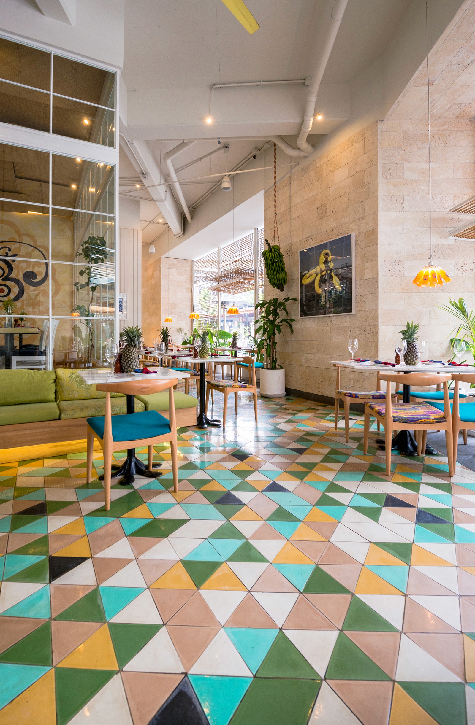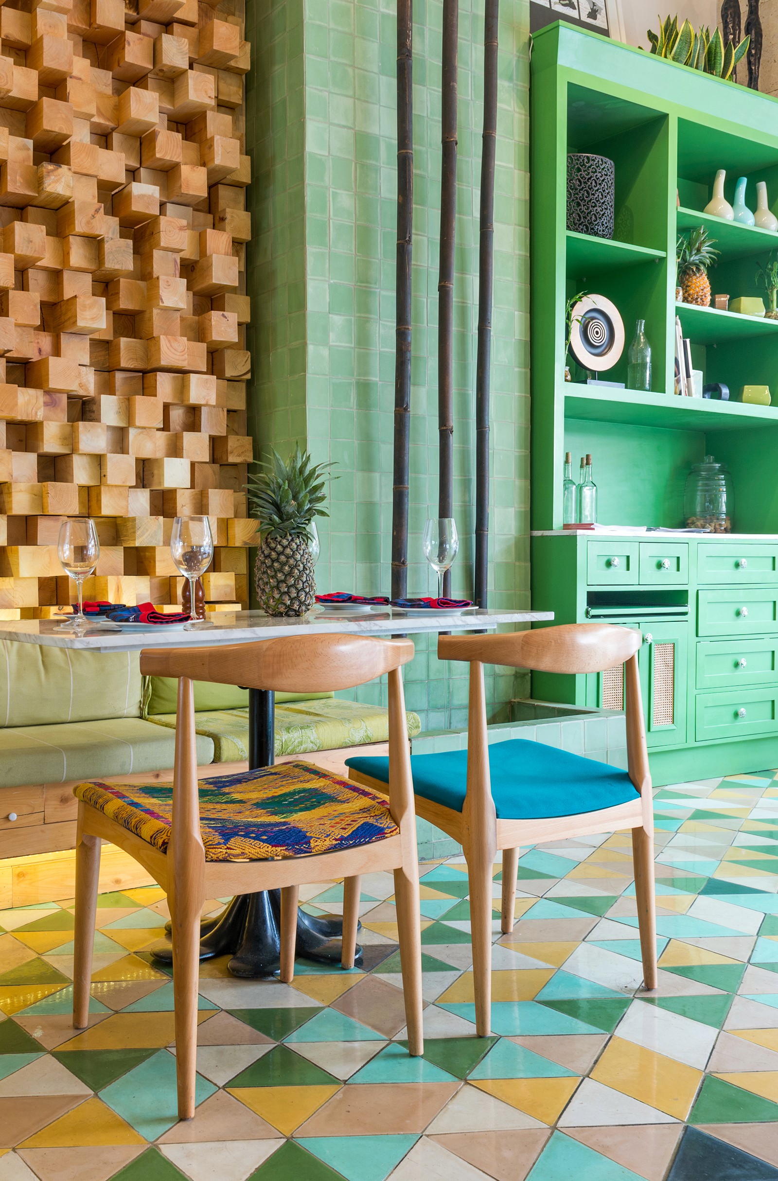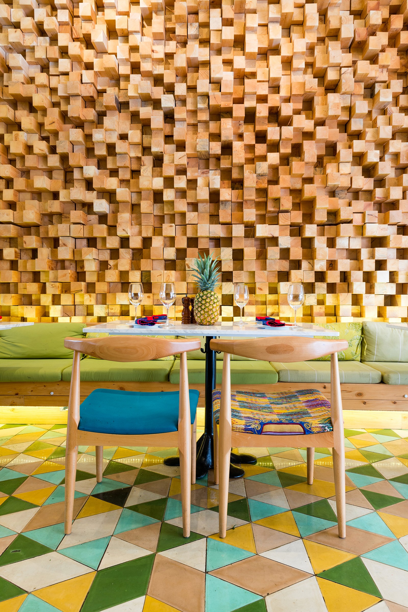 Set in the warm-weather environment of Guatemala City, the open-air Majadas café is left almost entirely open to the vibrant pedestrian walkway that runs alongside it. Without any glass to enclose the café, Taller KEN designed custom folding shutters, made of steel frames interwoven with slim wood dowels, to define the exterior. When the shutters rise, rows of large potted plants are revealed which lightly and lushly define the bounds of the café. Inside, custom concrete tiles arranged in a vibrant pattern lead visitors through a space that can be experienced differently with each visit. Wood chairs with patterned upholstery mix with white marble tabletops and playful lighting fixtures made of bright yellow campari bottles. A vaulted seating area in the center is framed in glass to offer privacy, with an undulating wood-block feature wall adding texture and dimension.