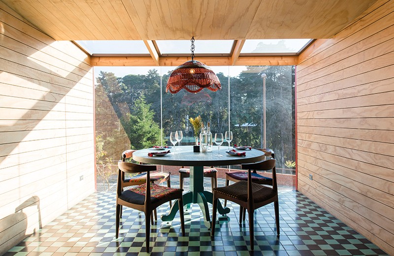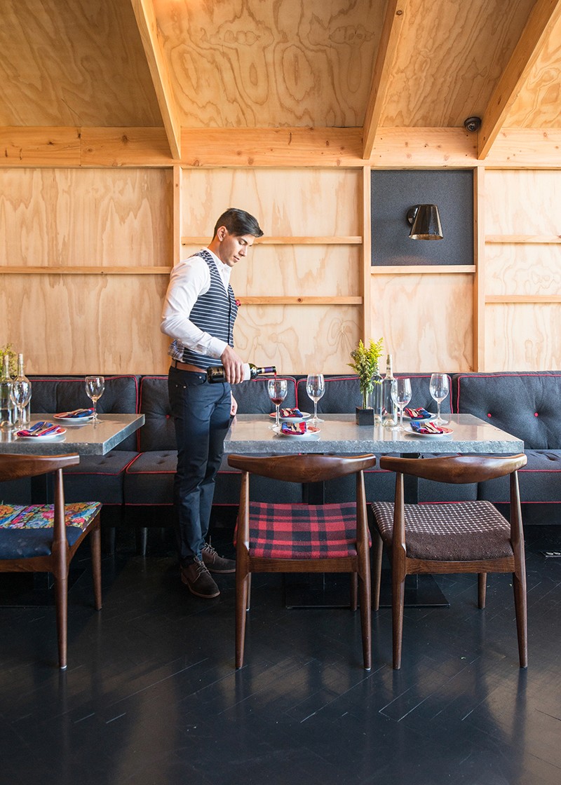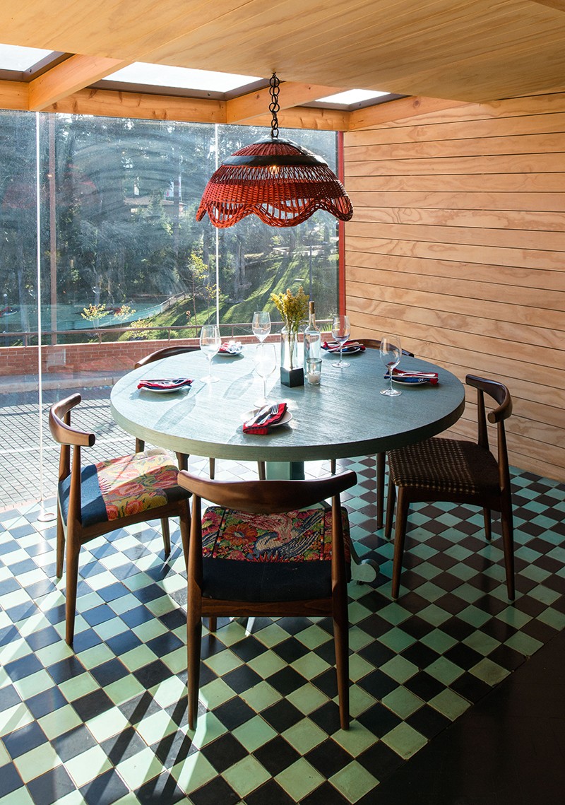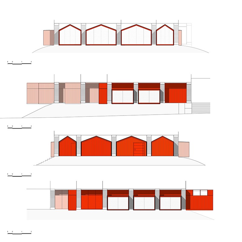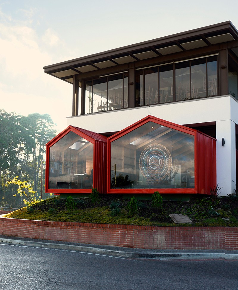 As a result, red corrugated house-shaped containers cantilever out past the usual infill constraints of the shopping mall, giving the project the eye-catching feeling of an art installation or something that is extra-ordinary from the context. This subversive approach to the site gives the clients a stronger commercial presence and questions the conventional building type. This attitude is largely contrasts attitudes for the region regarding retail and commercial projects. Even in big cities, the culture is very car-oriented, and oriented around shopping centers. In order to create intimate spaces each container is placed within the existing concrete structural grid of the mall. The interiors are wrapped with natural materials such as finished plywood, felt, and bales of leaves for a rustic and effect. The bathrooms, window boxes and separations between the containers are demarcated by a checker-pattern of traditional handmade cement tile.