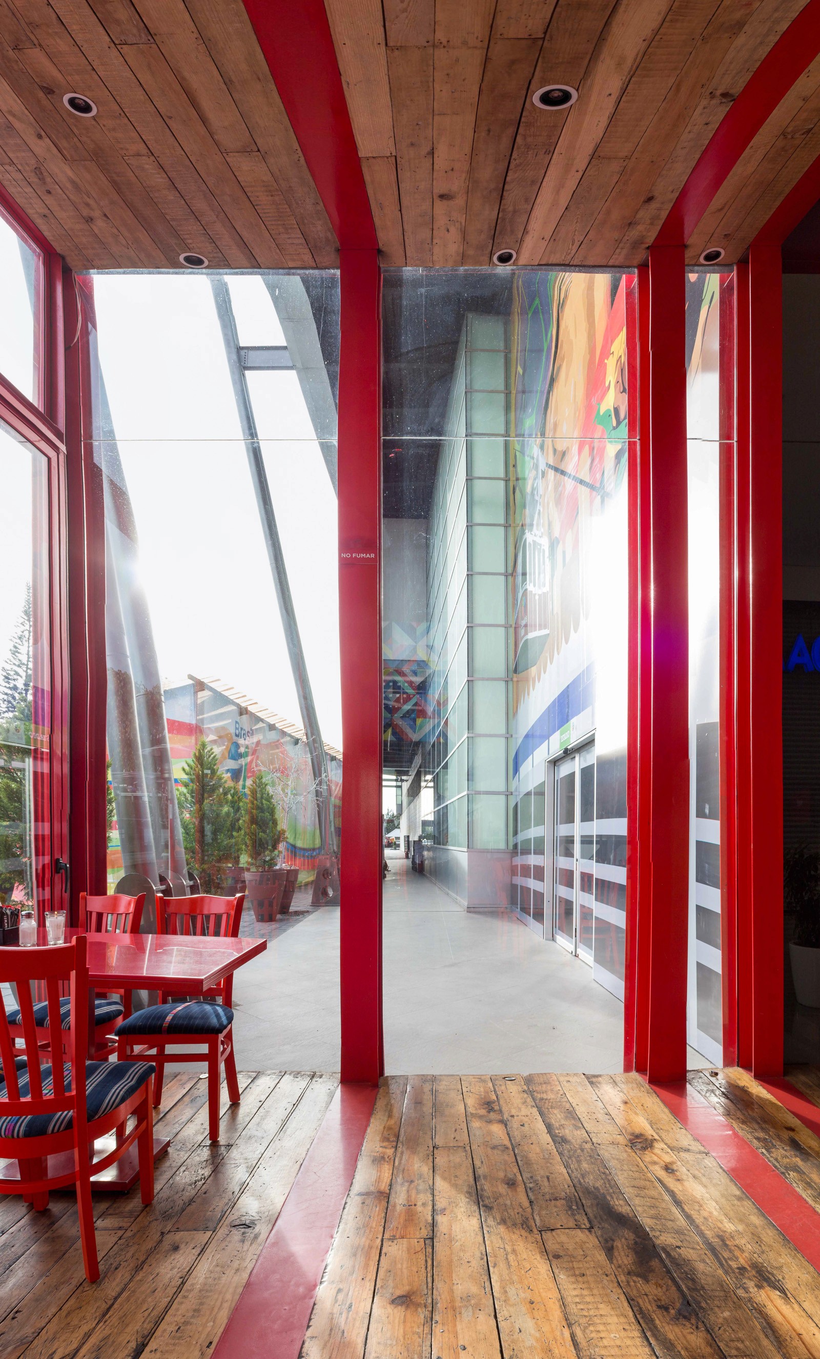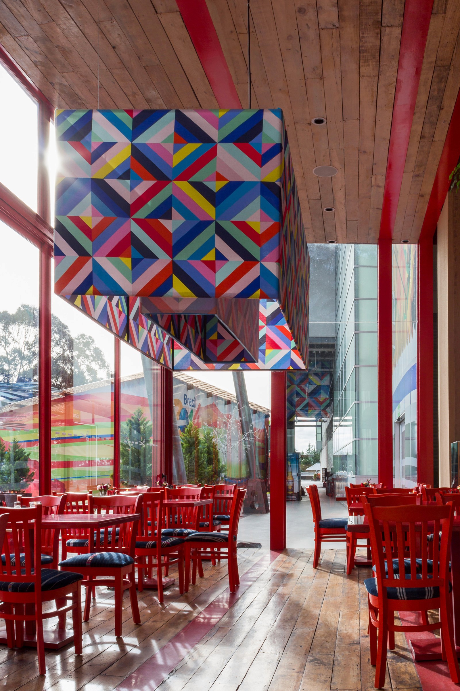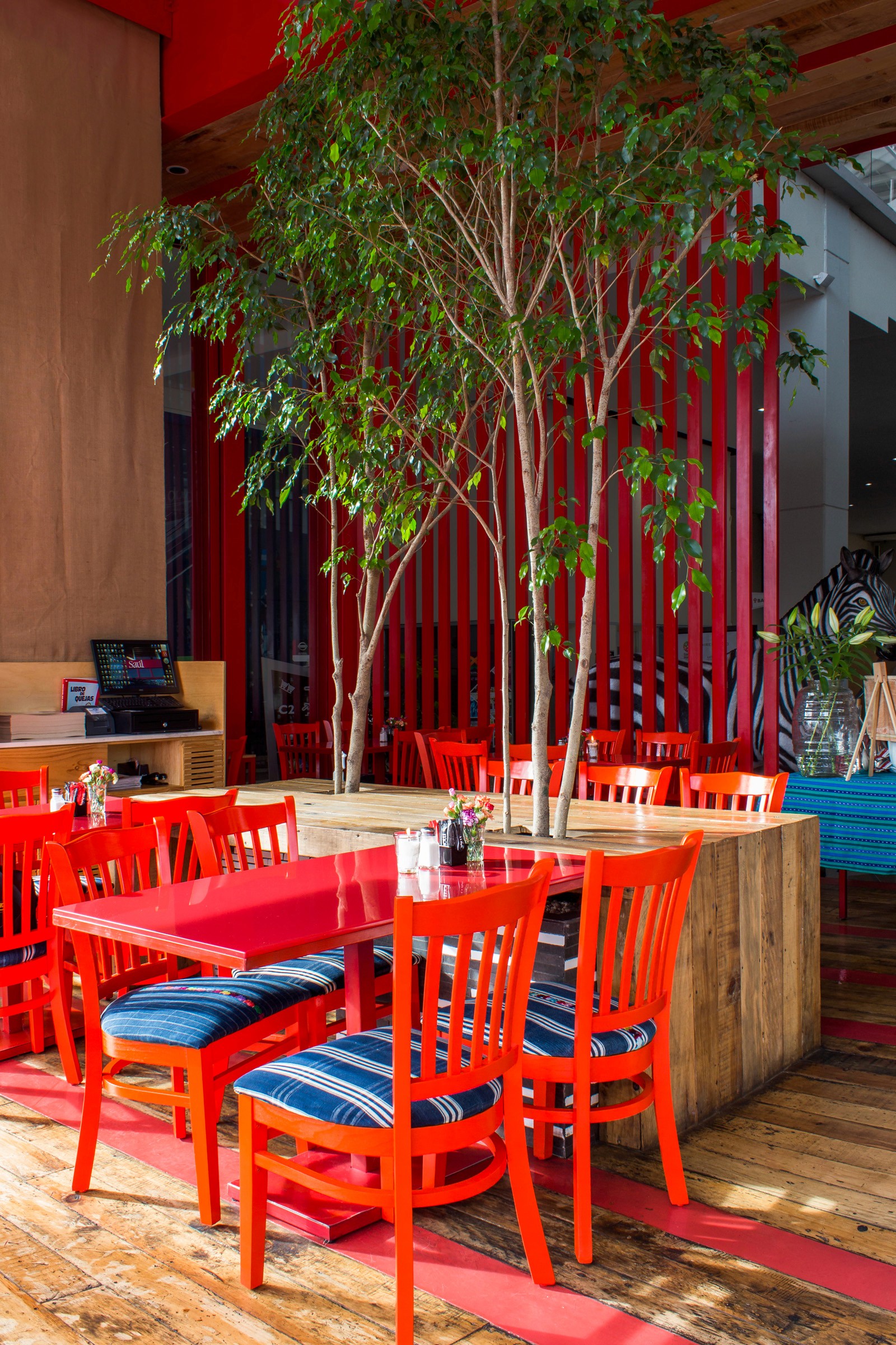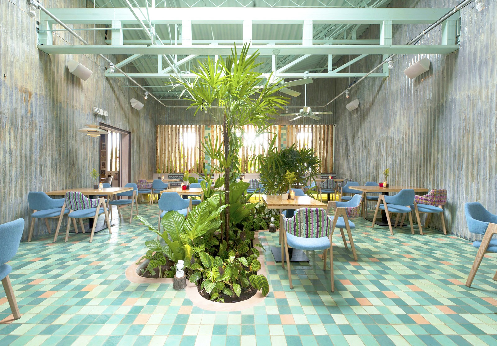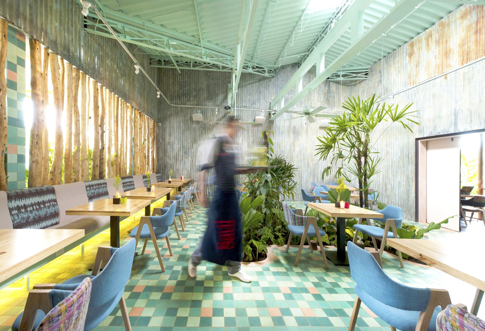 At the heart of the dining room, a central garden anchors the space. Lush vegetation grows directly from the floor, dissolving the boundary between interior and landscape and creating a calm, immersive atmosphere. Turquoise ceramic tiles bring vibrancy and freshness, contrasting with warm wood floors, soft upholstery, and handcrafted details.
