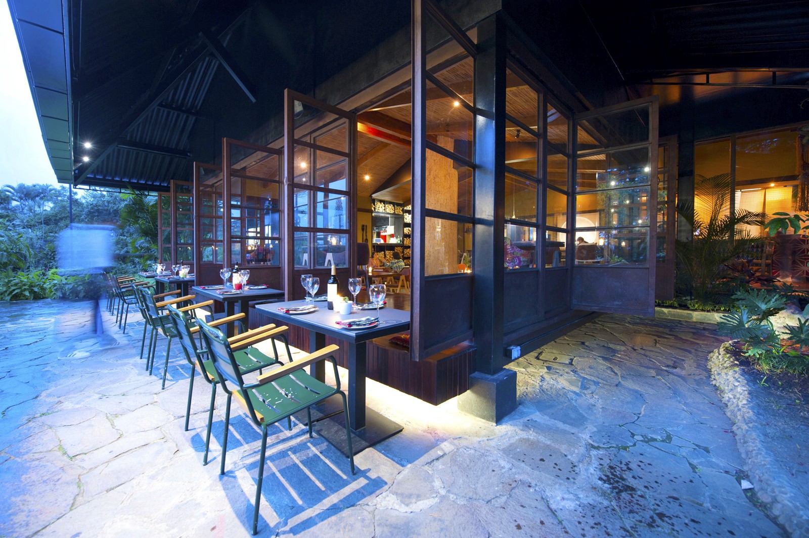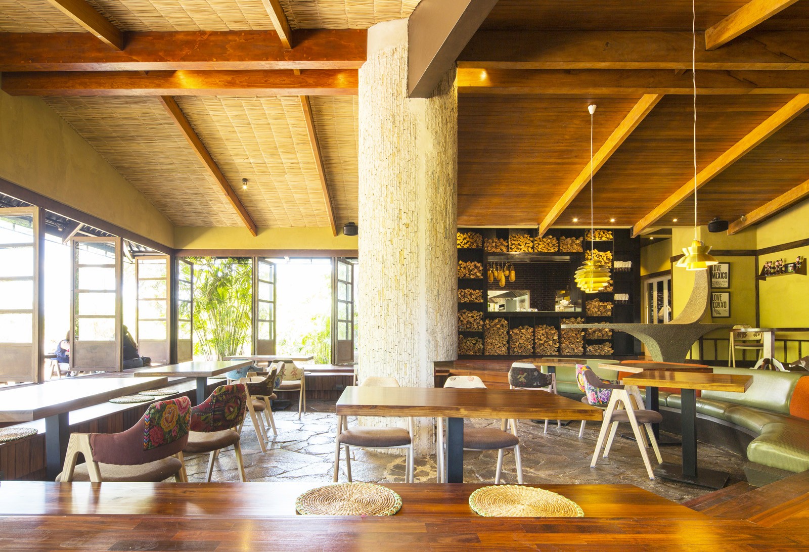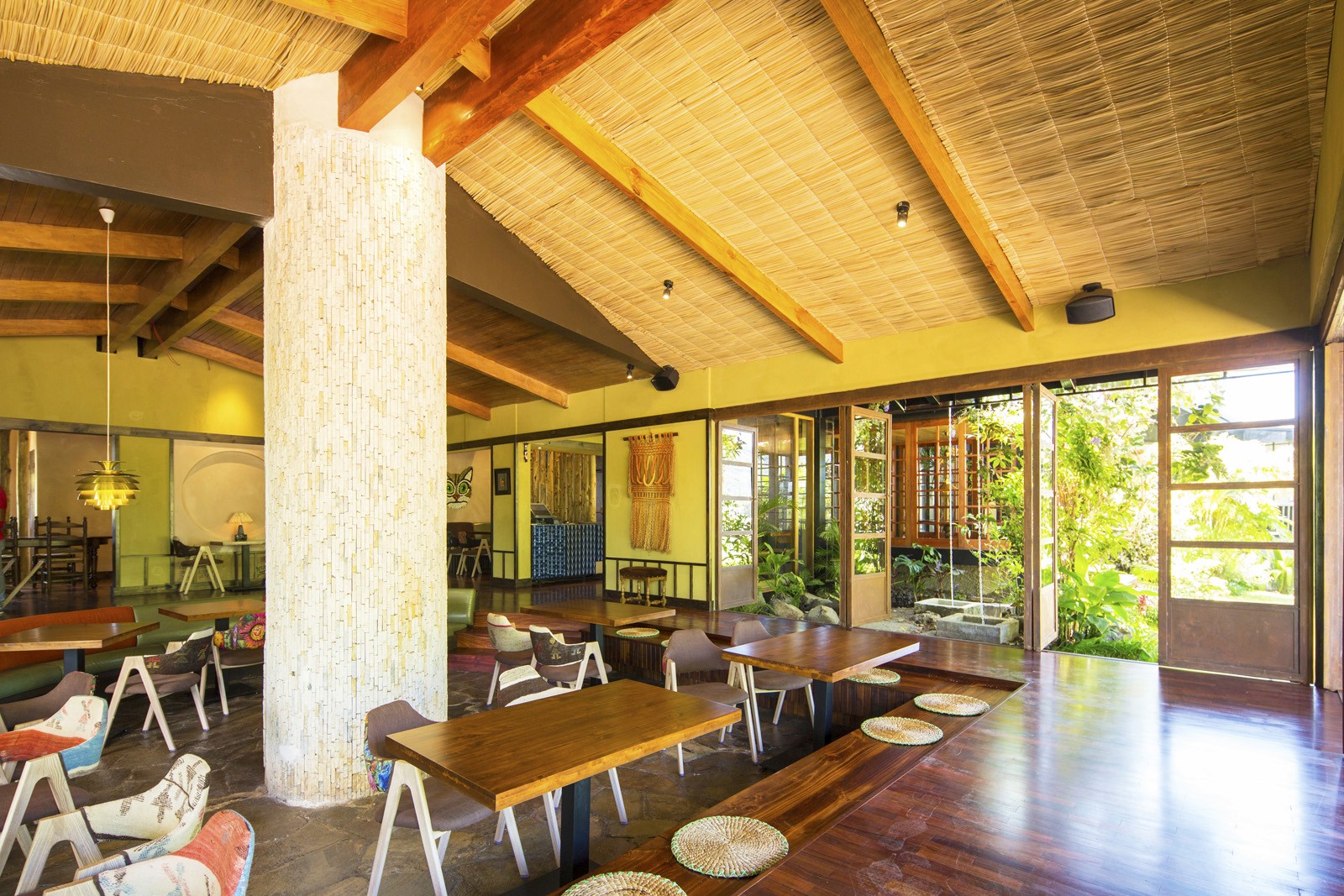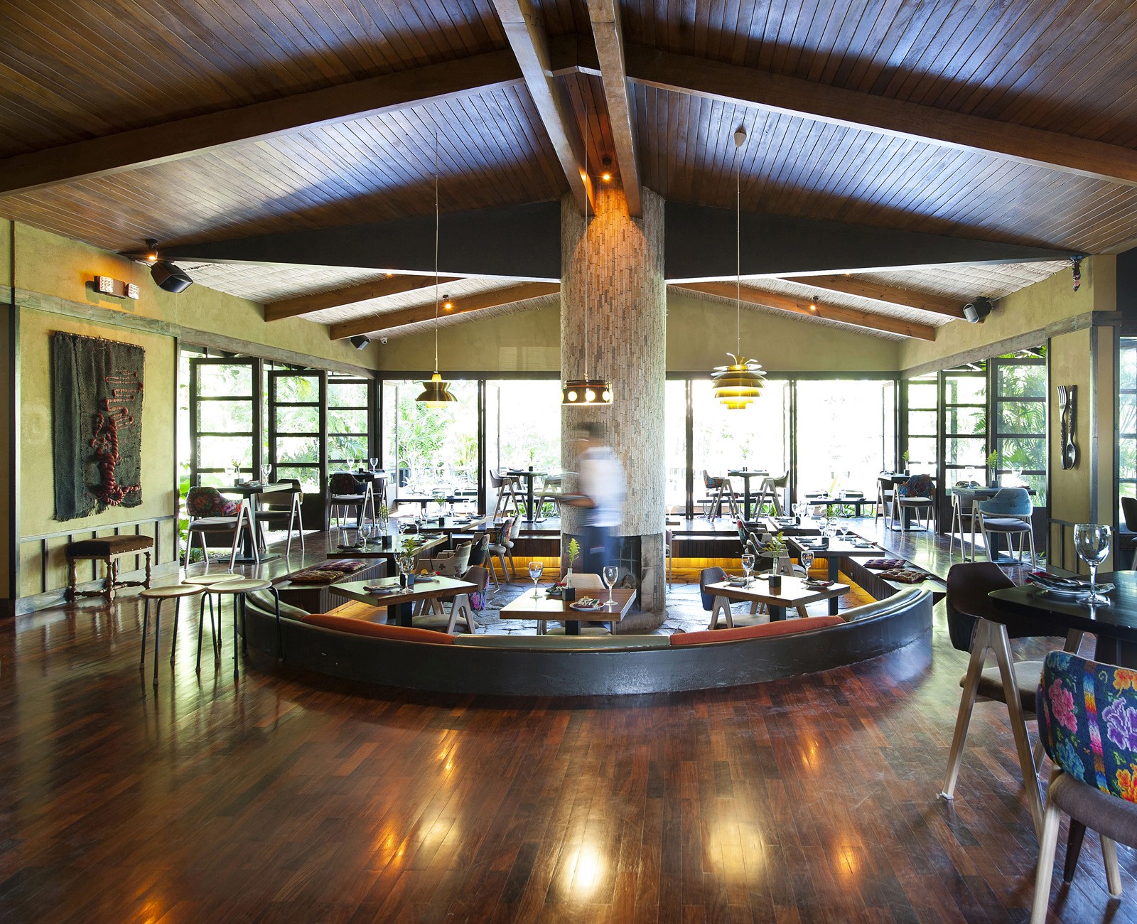 This restaurant is conceived as a contemporary tropical retreat—an architecture that breathes, opens, and connects directly to its surroundings. A pitched metal roof and exposed steel structure define a generous, naturally ventilated volume, while textured walls and ceiling fans reinforce a relaxed, climate-responsive approach.