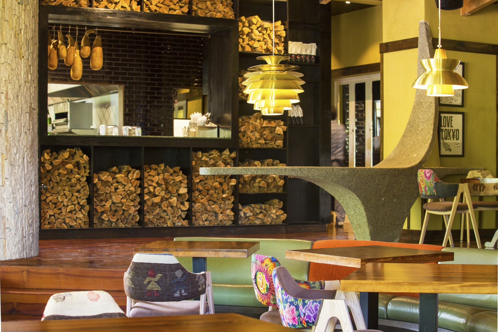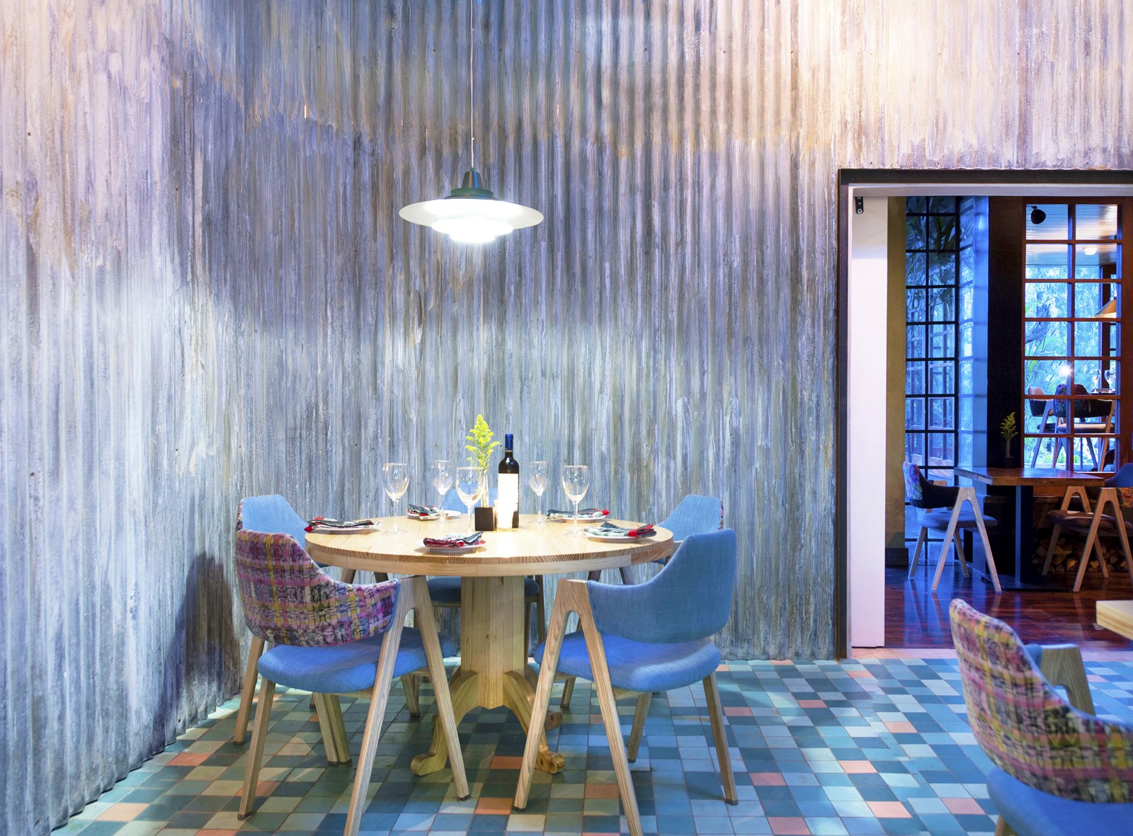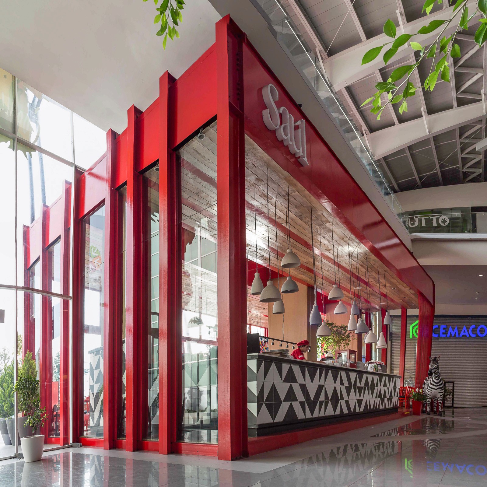 This restaurant is conceived as a contemporary tropical retreat—an architecture that breathes, opens, and connects directly to its surroundings. A pitched metal roof and exposed steel structure define a generous, naturally ventilated volume, while textured walls and ceiling fans reinforce a relaxed, climate-responsive approach.