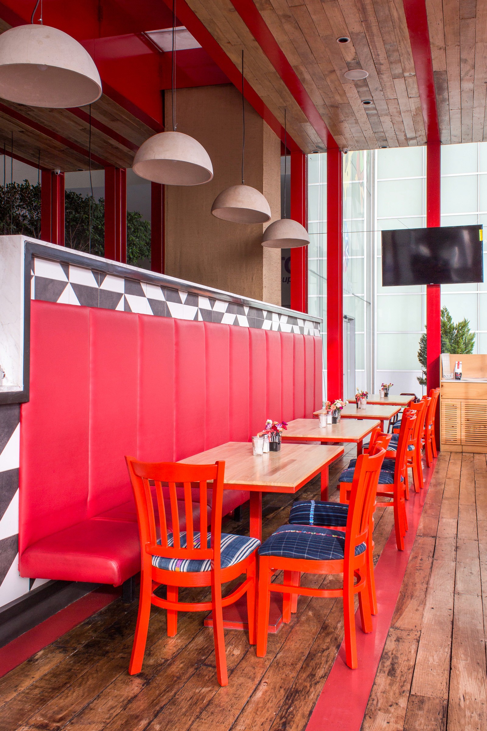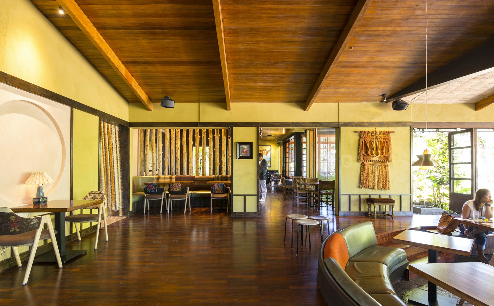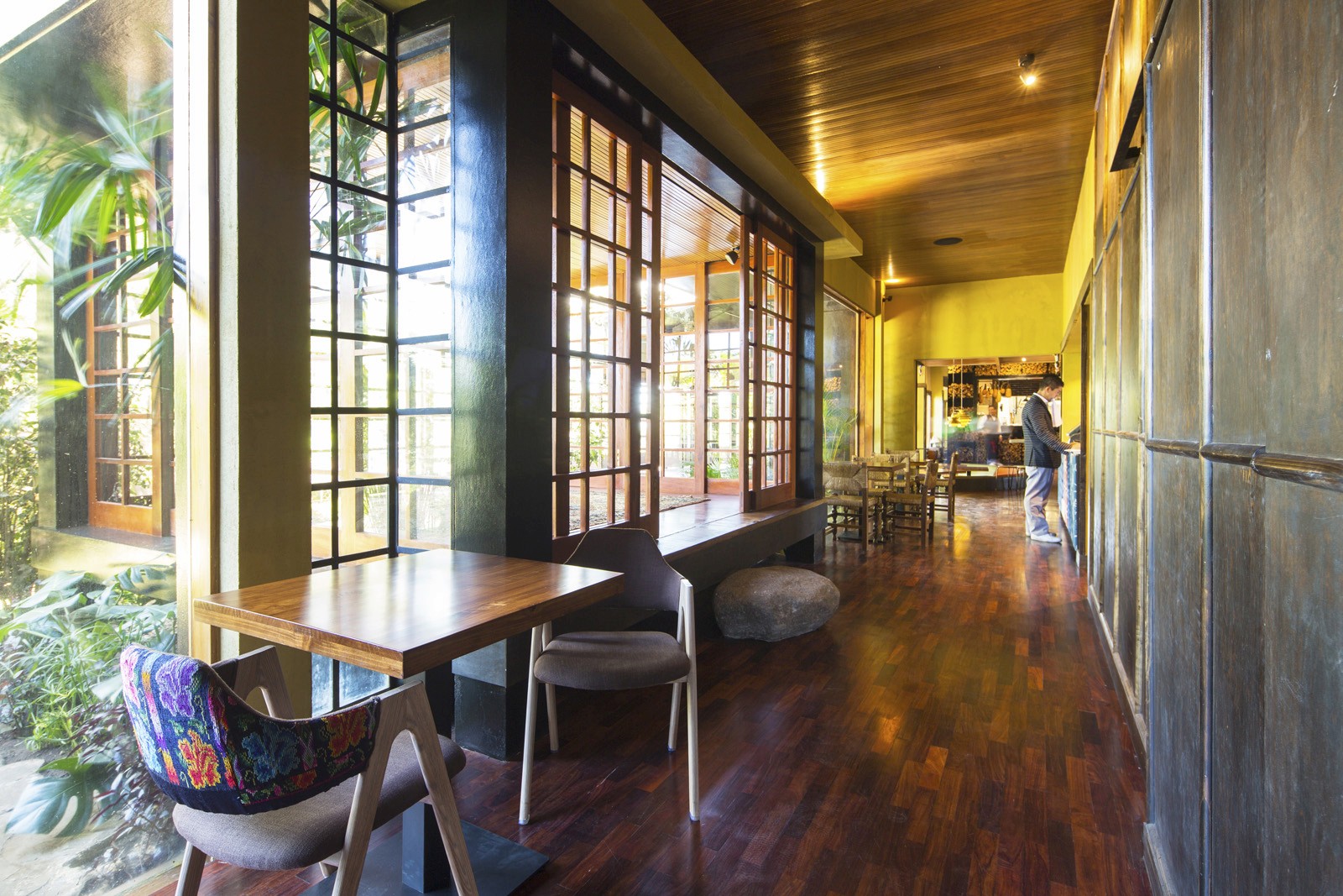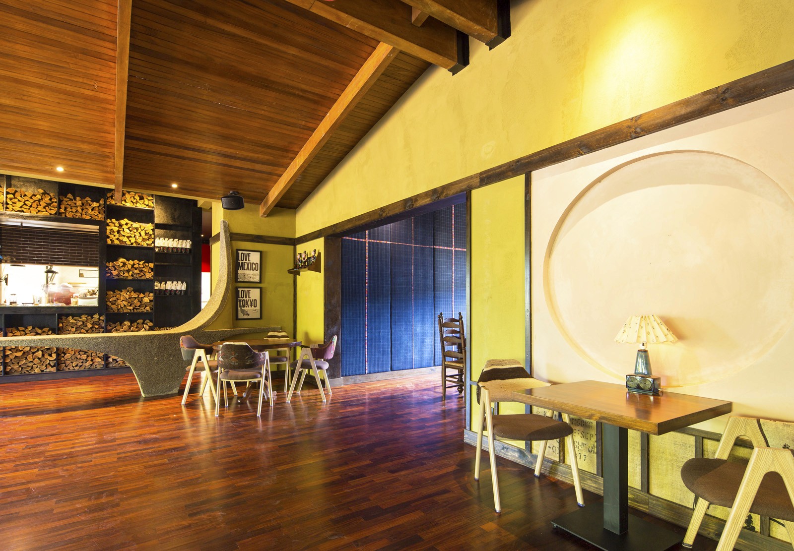 This restaurant is conceived as a contemporary tropical retreat—an architecture that breathes, opens, and connects directly to its surroundings. A pitched metal roof and exposed steel structure define a generous, naturally ventilated volume, while textured walls and ceiling fans reinforce a relaxed, climate-responsive approach.
