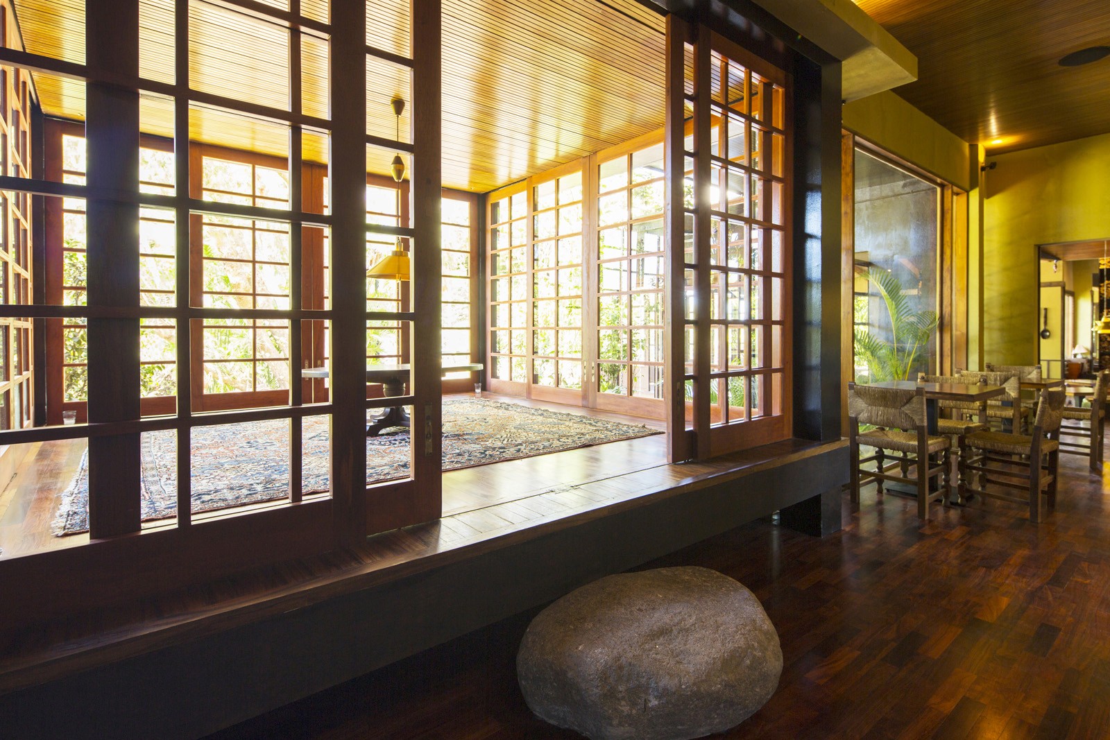 Large operable glass doors fold open to the terrace, allowing the restaurant to transition seamlessly from enclosed pavilion to open-air veranda. By day it feels light and airy; by night it glows warmly within the garden. The result is a sensory, welcoming restaurant where nature, material warmth, and contemporary detailing converge.