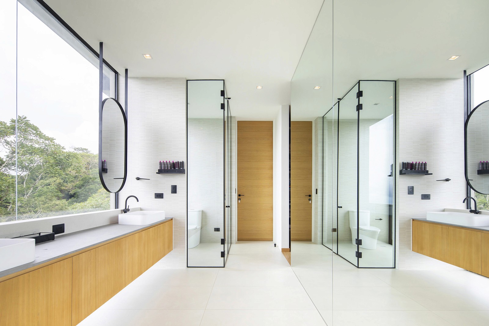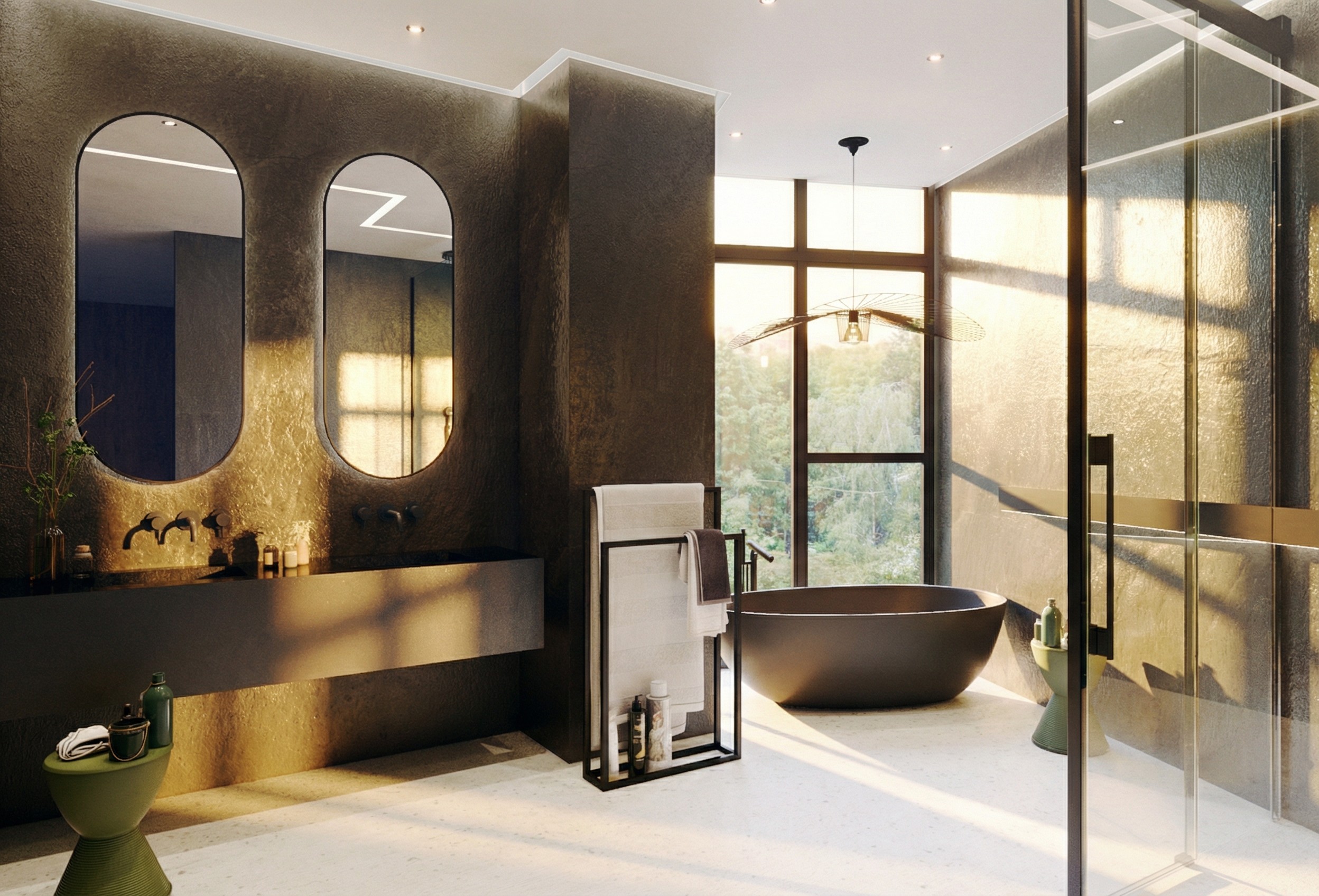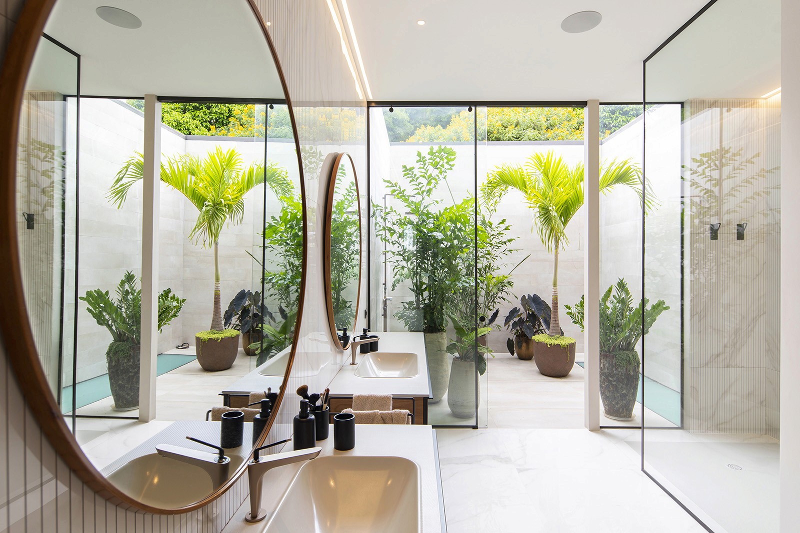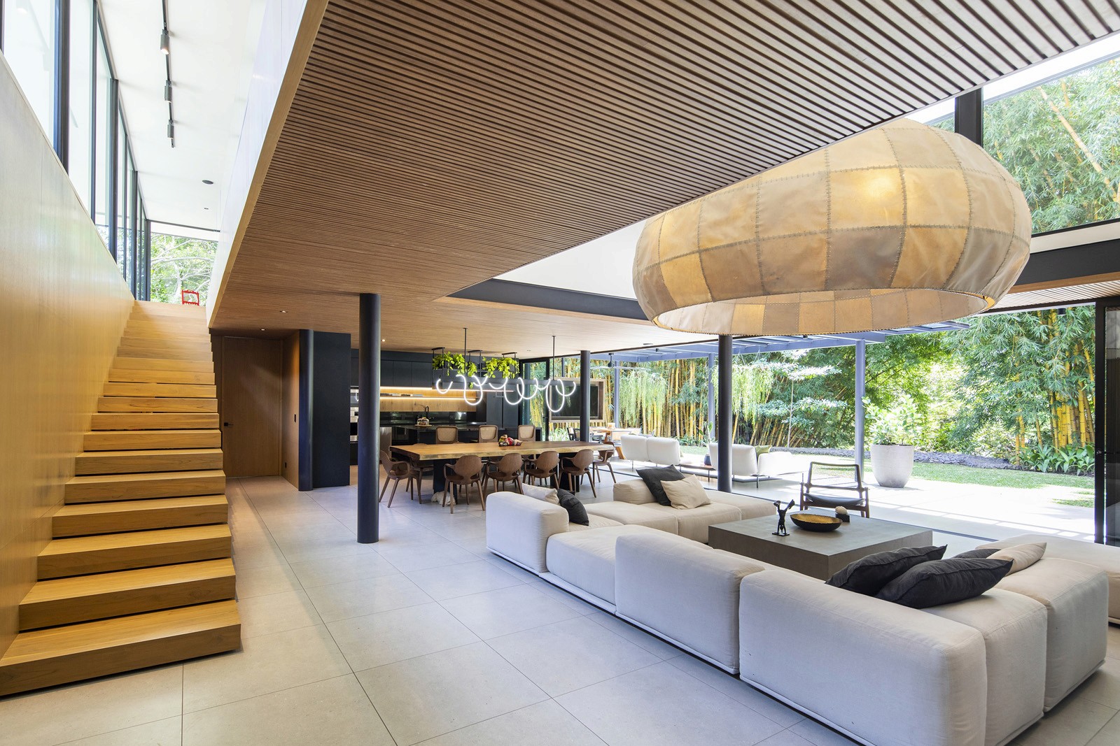 Expansive glazing dissolves boundaries between interior and landscape, drawing nature into daily life. In private areas, darker materials and controlled light create a contemplative atmosphere, transforming bathing and rest into immersive experiences. The project balances precision with warmth, creating a home that feels expressive yet grounded—an environment designed for connection, comfort, and discovery.