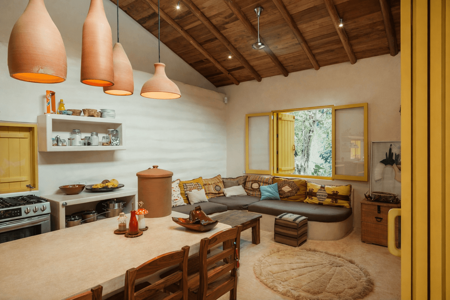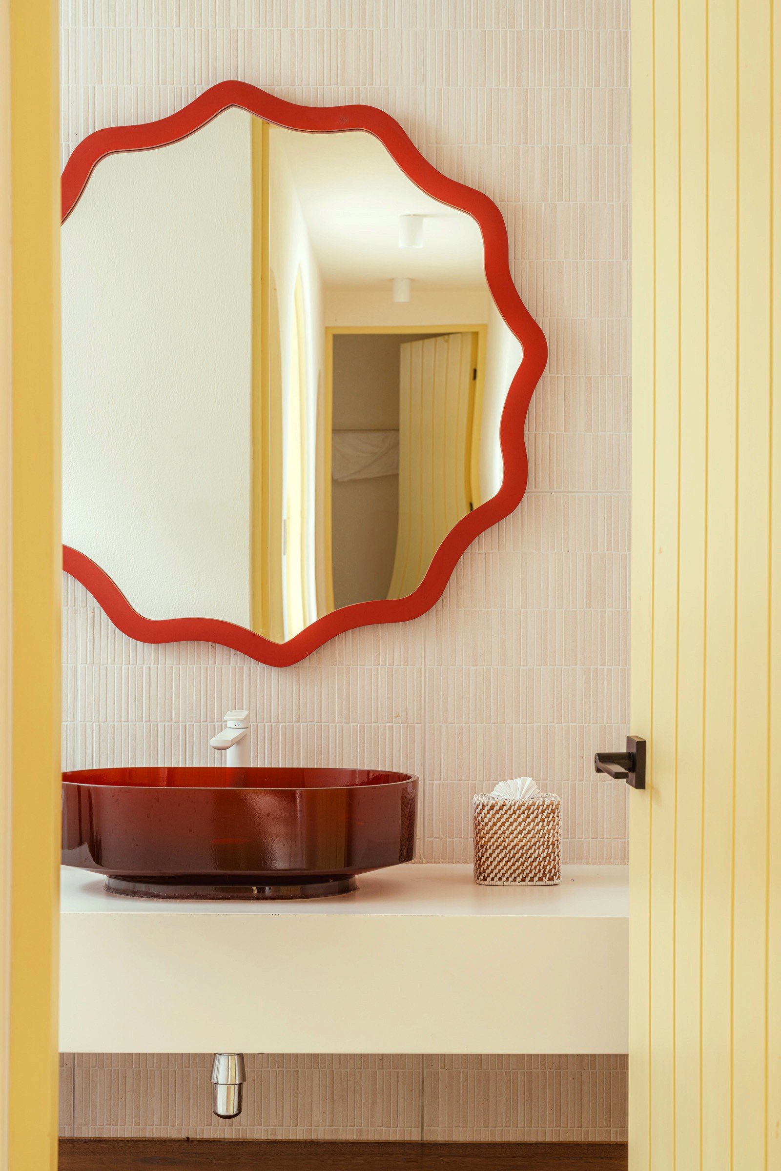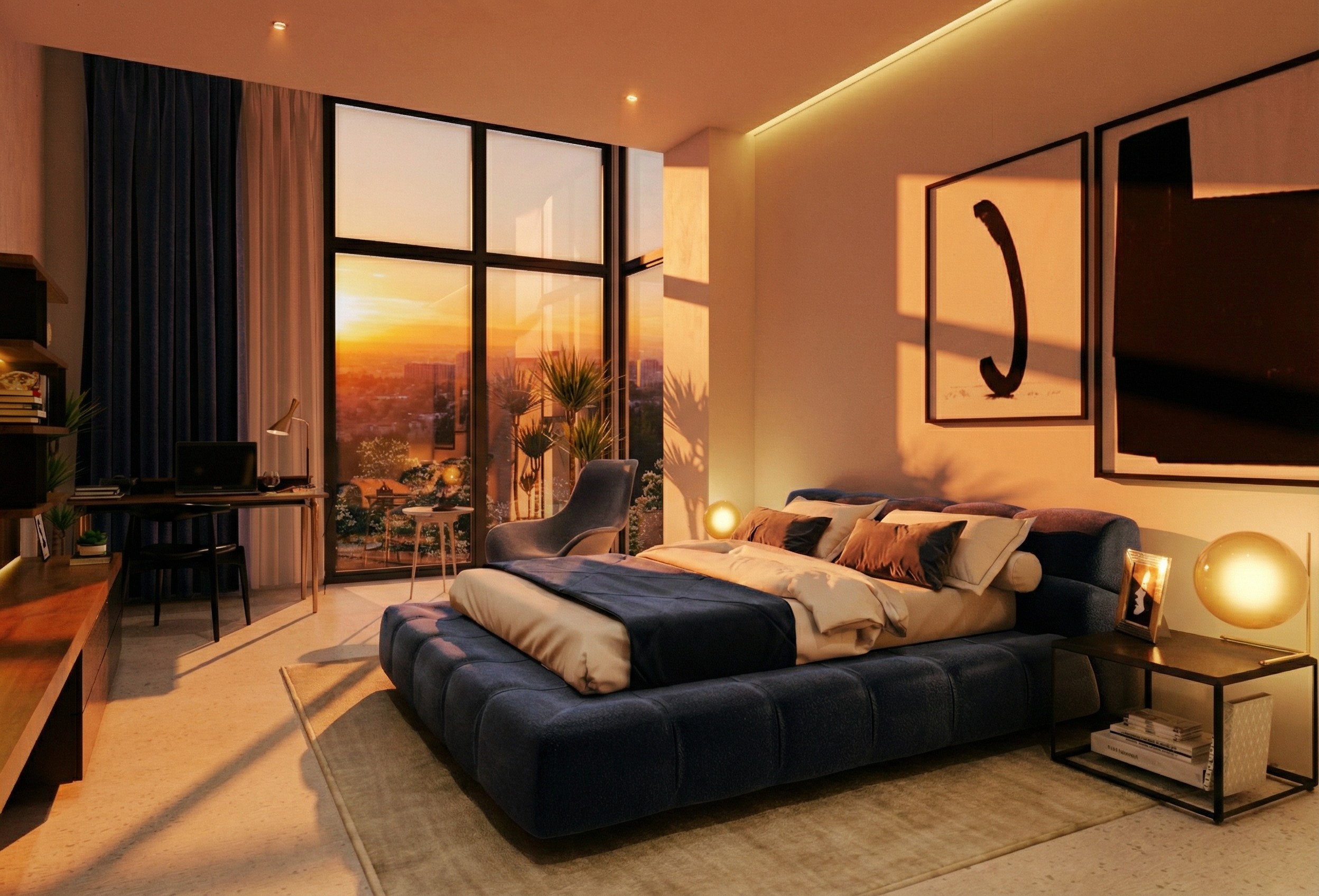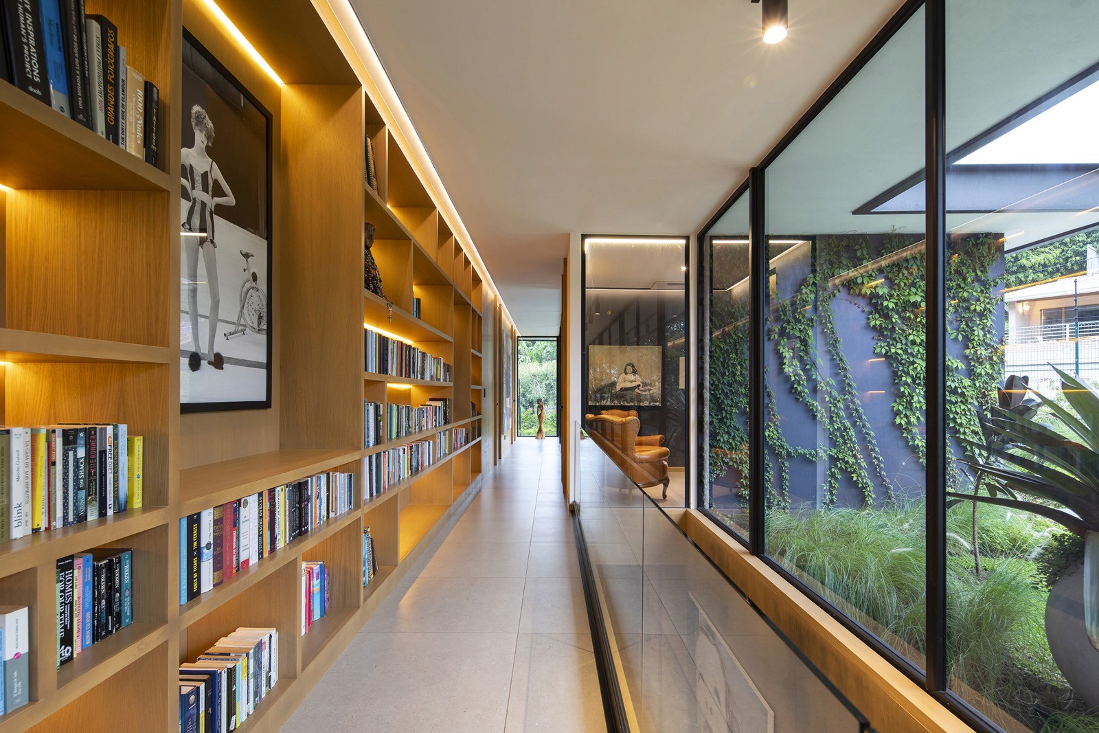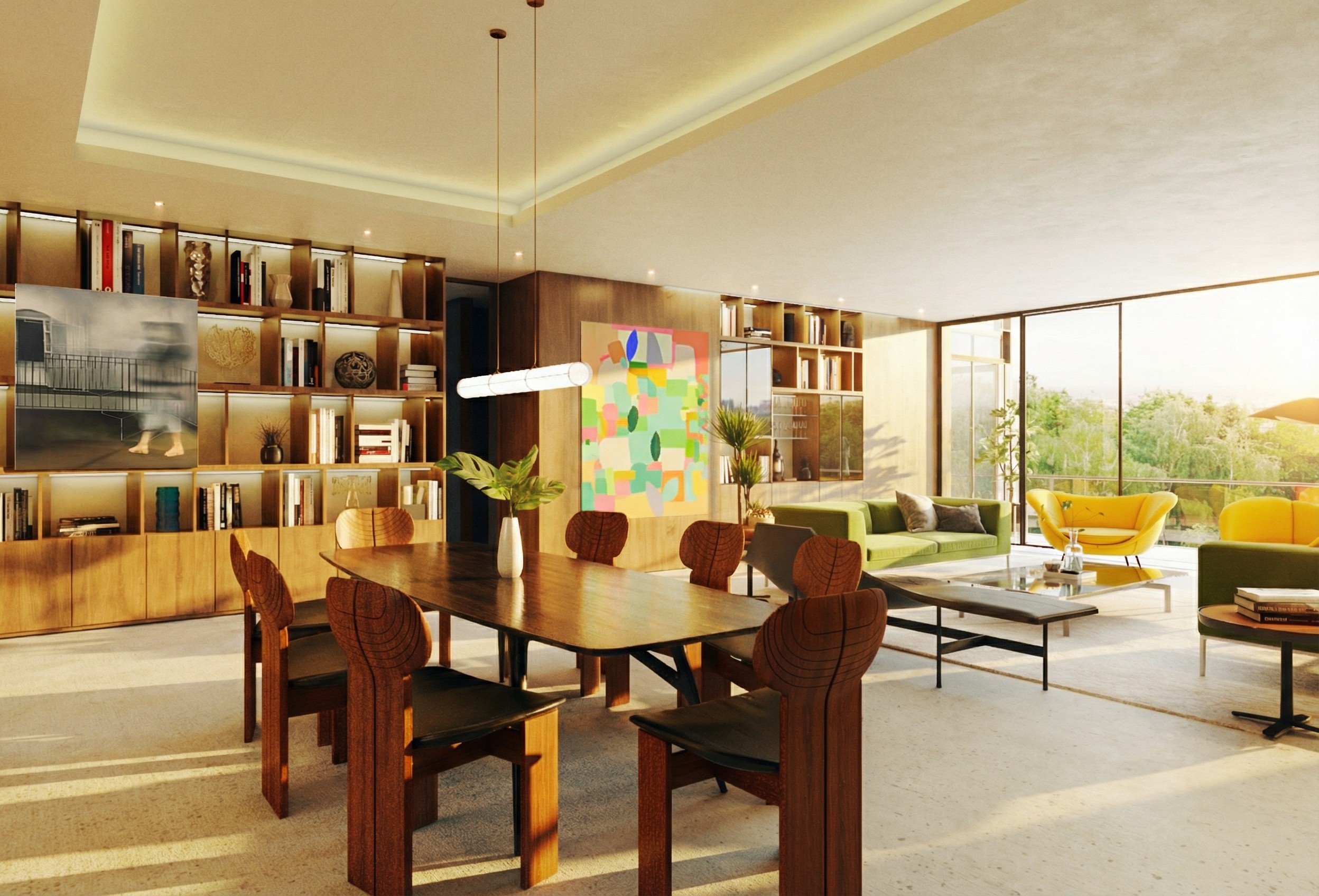This residence explores contrast as a spatial narrative—where warmth and depth meet clarity and light. Rich wood paneling wraps the social areas in a continuous architectural gesture, integrating storage, display, and art into a living backdrop that feels both curated and intimate. Against this textured envelope, sculptural furniture in vivid tones introduces moments of play and personality, activating the space with energy and softness.