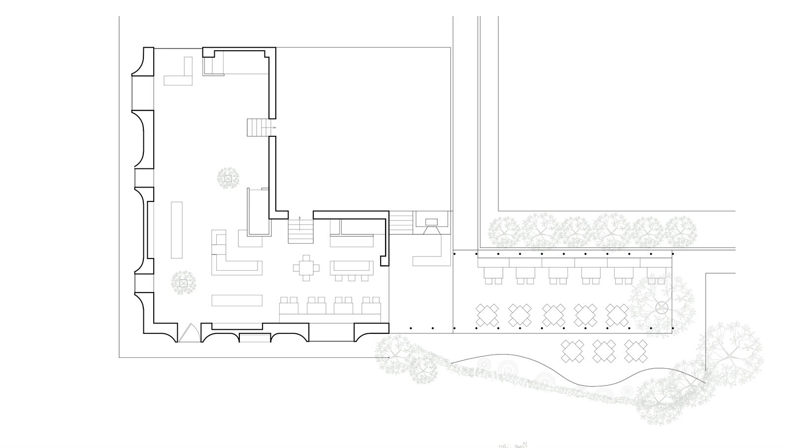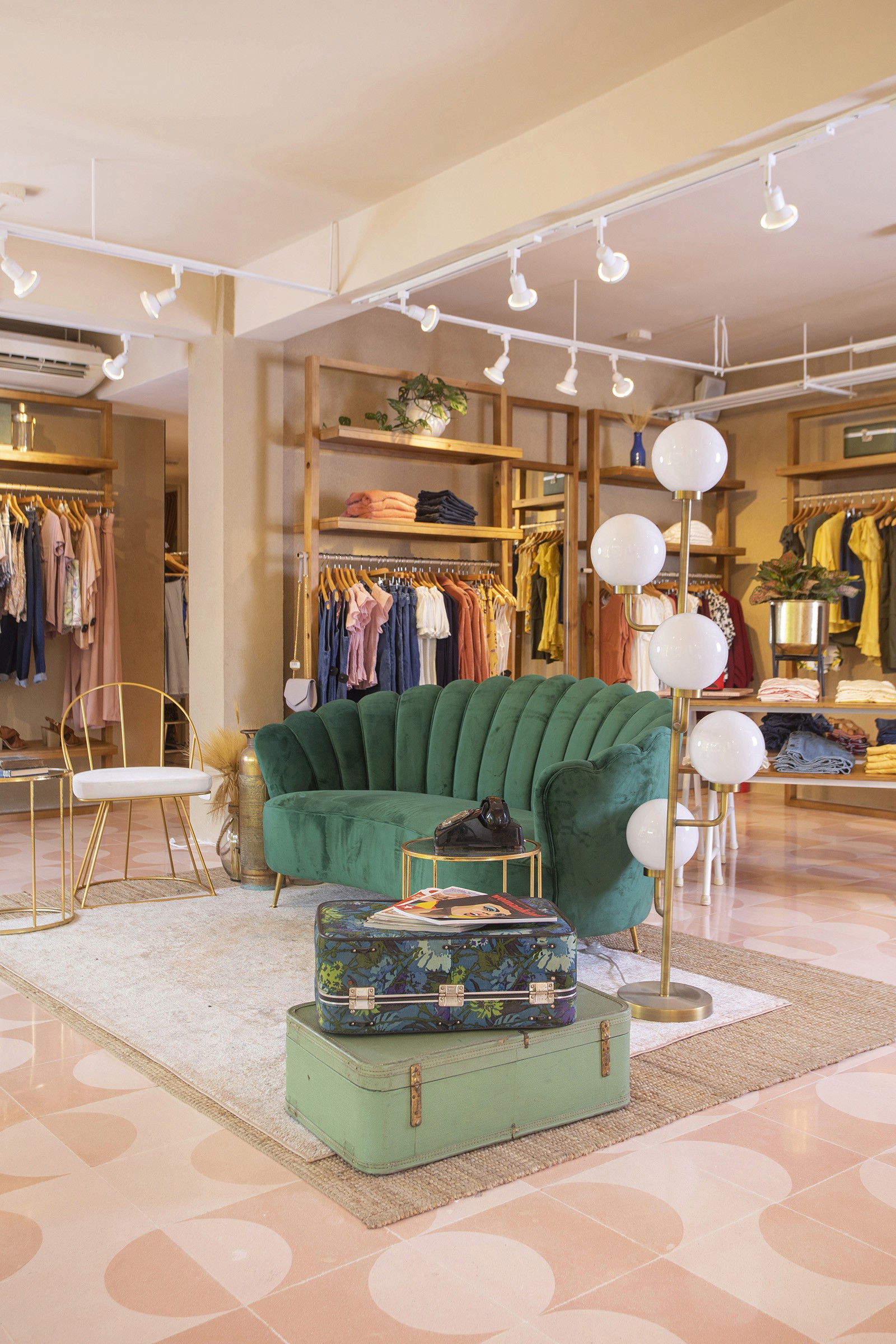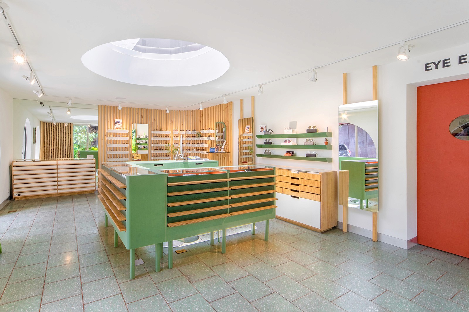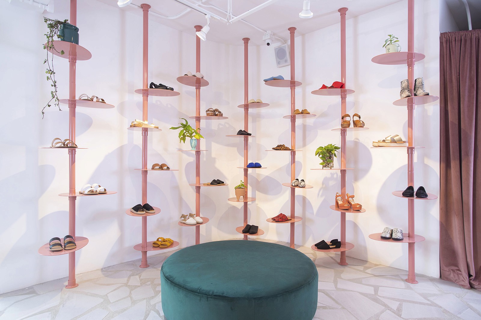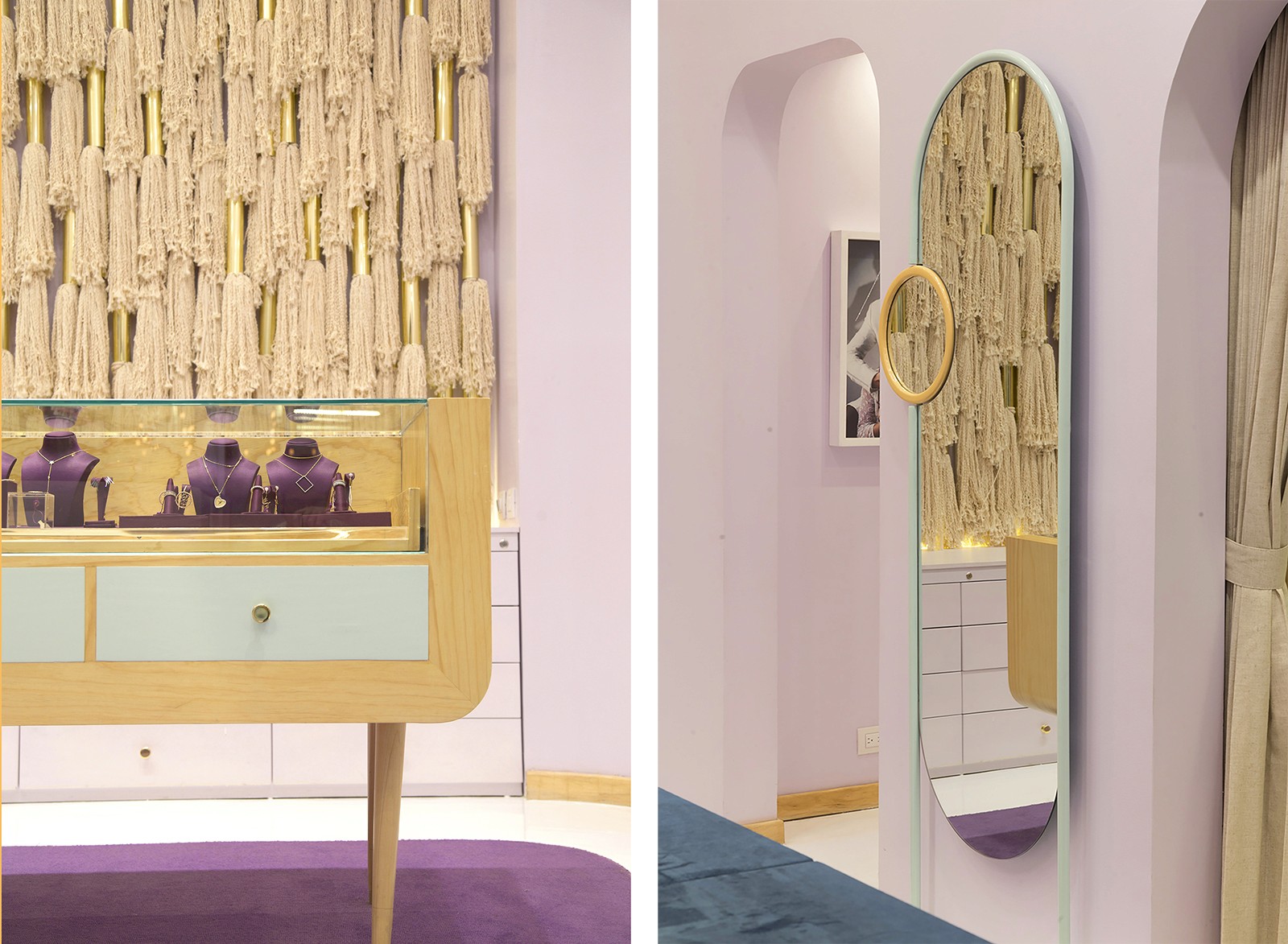 Conceived as a modern chapel, the central room, anchored by an altar-like display island, opens up to small votive niches which offer a more intimate experience with the shop’s jewelry. One, a sculptural cave that you slip into through a slim, framed doorway, features mirrored, faceted gold-toned walls with a slim horizontal inset housing a sparkling jewelry display. Another holds a private showroom with custom-designed furnishings and a soft, curtained partition to offer privacy.